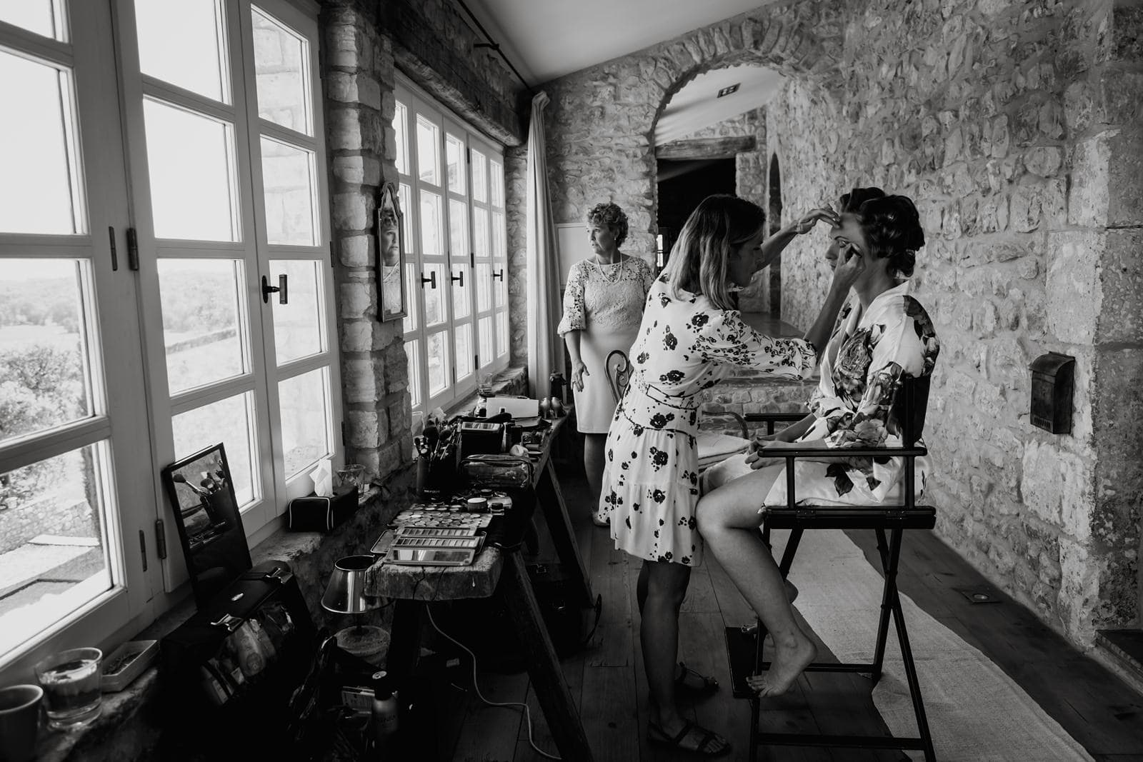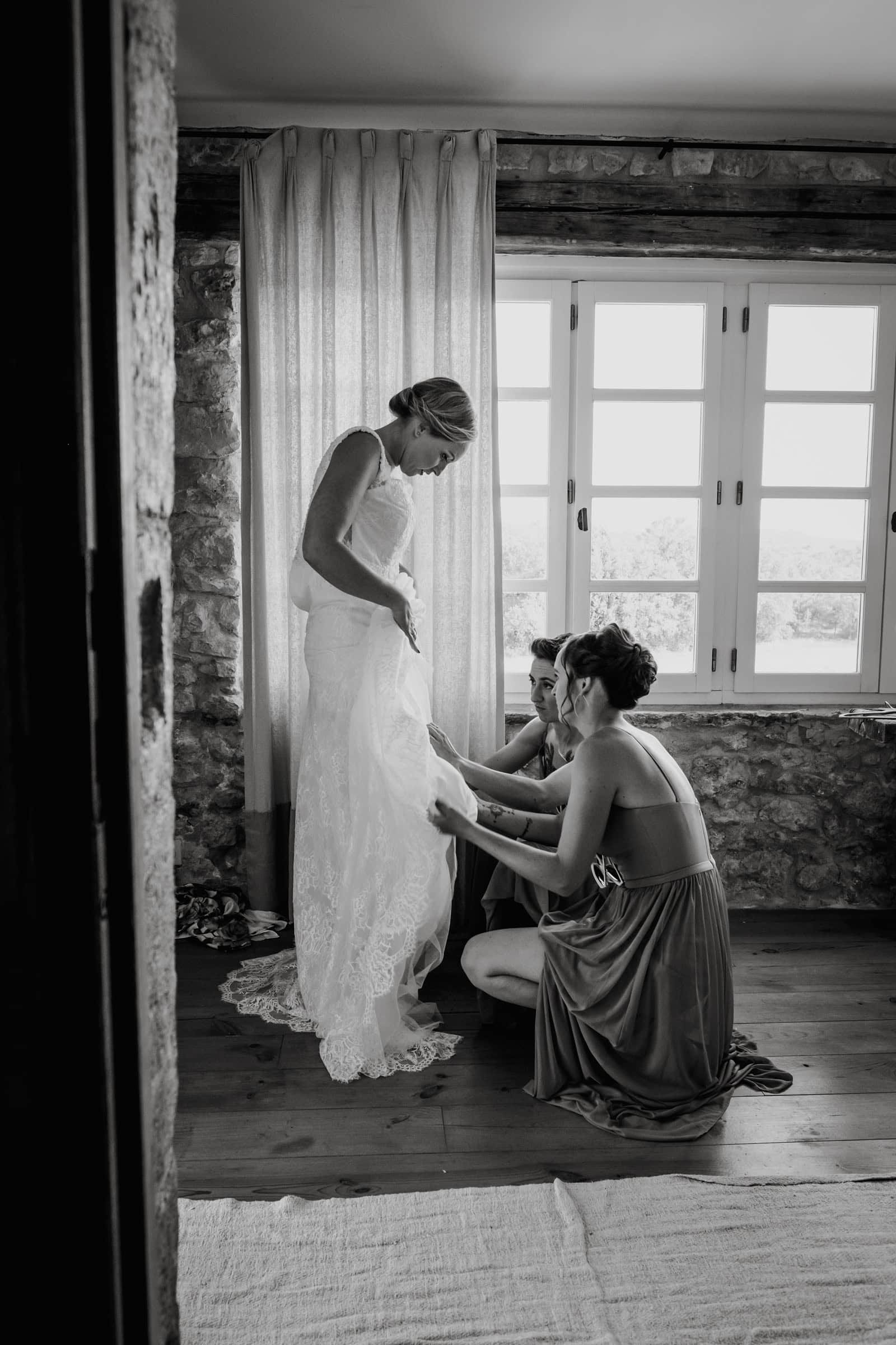 The bride and her closest friends spent the morning getting ready in the villa’s luxurious master suite. They sipped on wine and nibbled on local cheeses, fruit, and fresh bread from the Provençal market, setting a relaxed and joyful tone for the day.