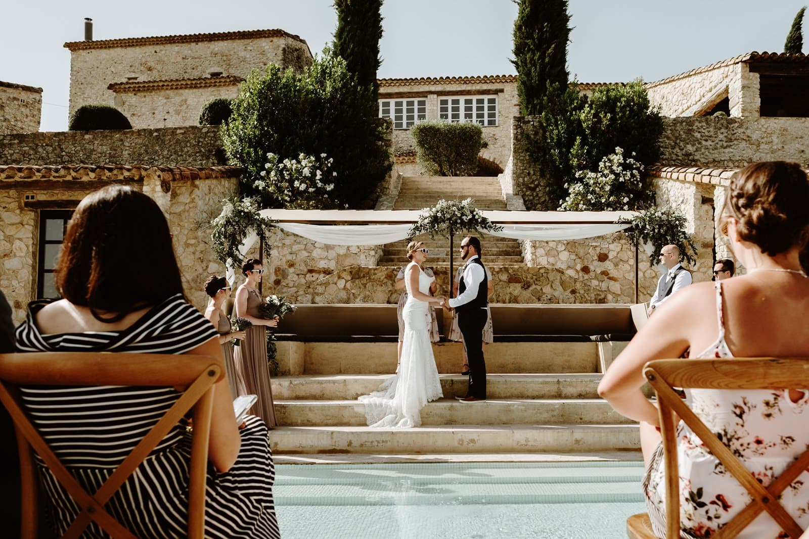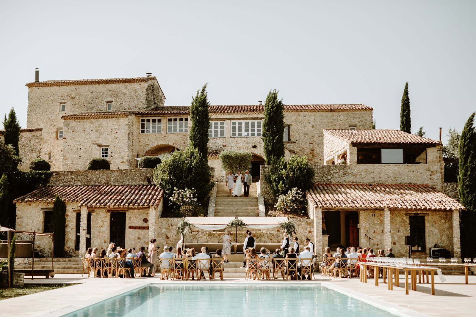 The ceremony took place by the villa’s pool, with sweeping views of the Provence countryside providing a breathtaking backdrop. The couple chose family members as officiants, making the exchange of vows deeply personal. A few close friends read passages from the couple’s favorite books, adding an extra layer of meaning to the moment.