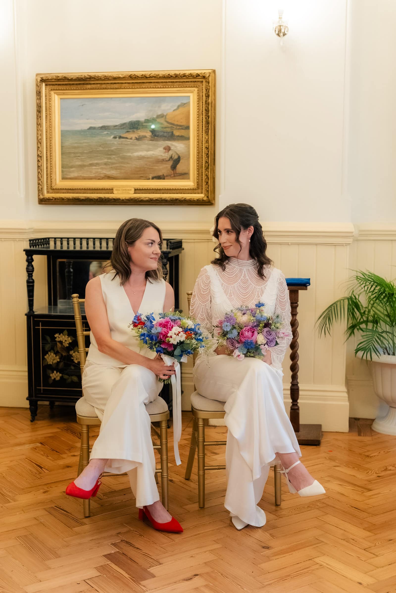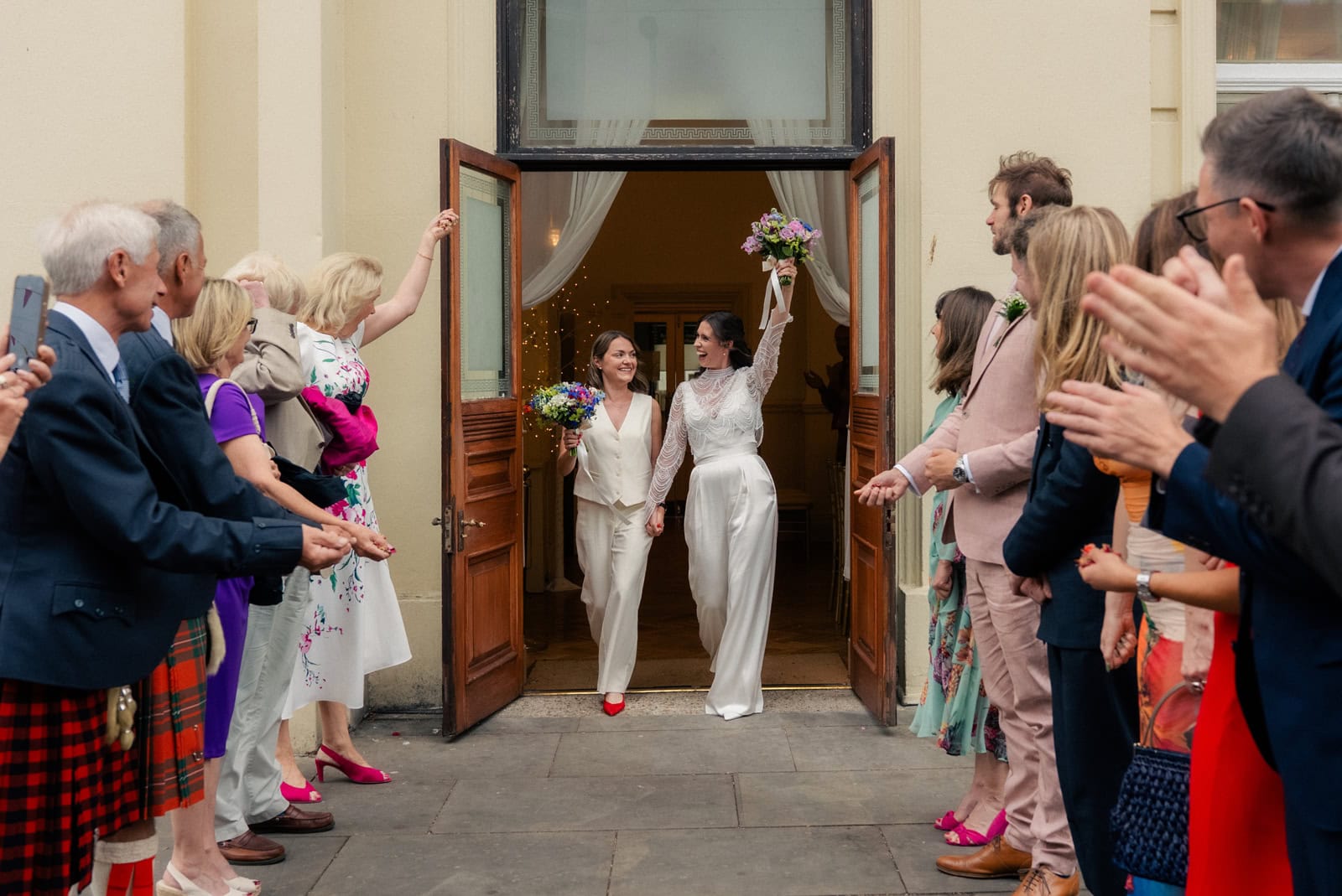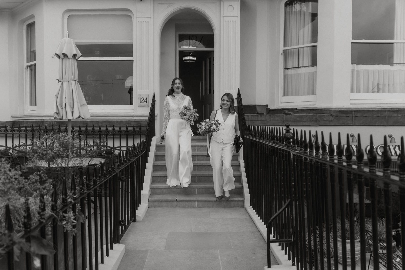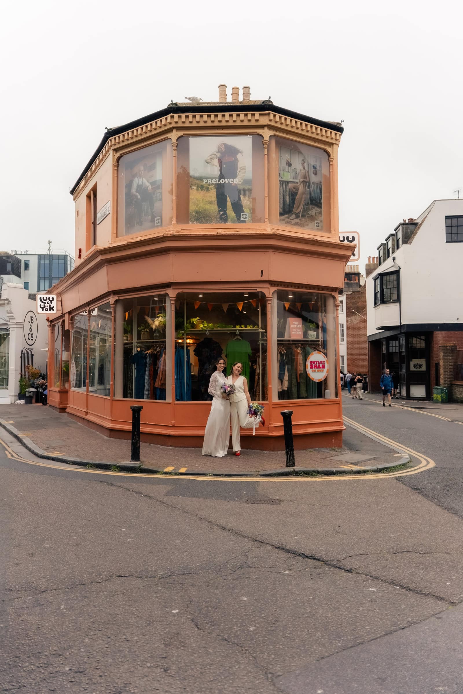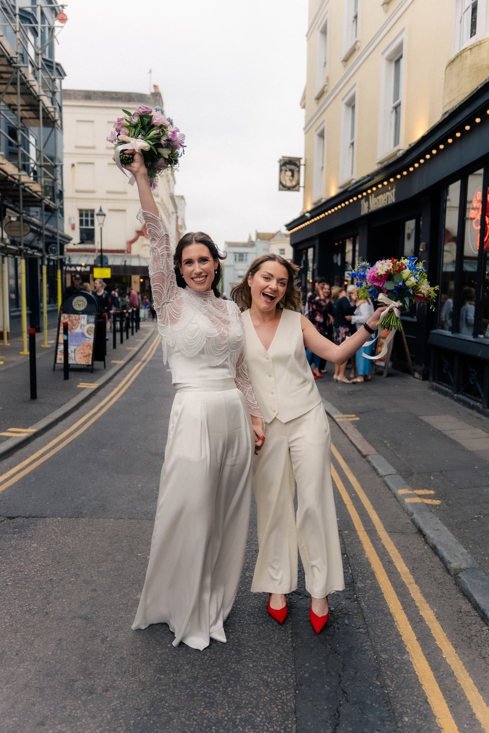 The couples photoshoot was relaxed and playful. They walked down the road in slightly windy conditions, jumped into a taxi, and tried to brave the seafront, though it was too windy and rainy. Overall, the wedding felt intimate, relaxed, and cheerful, perfectly reflecting Laura and Liv’s personalities.