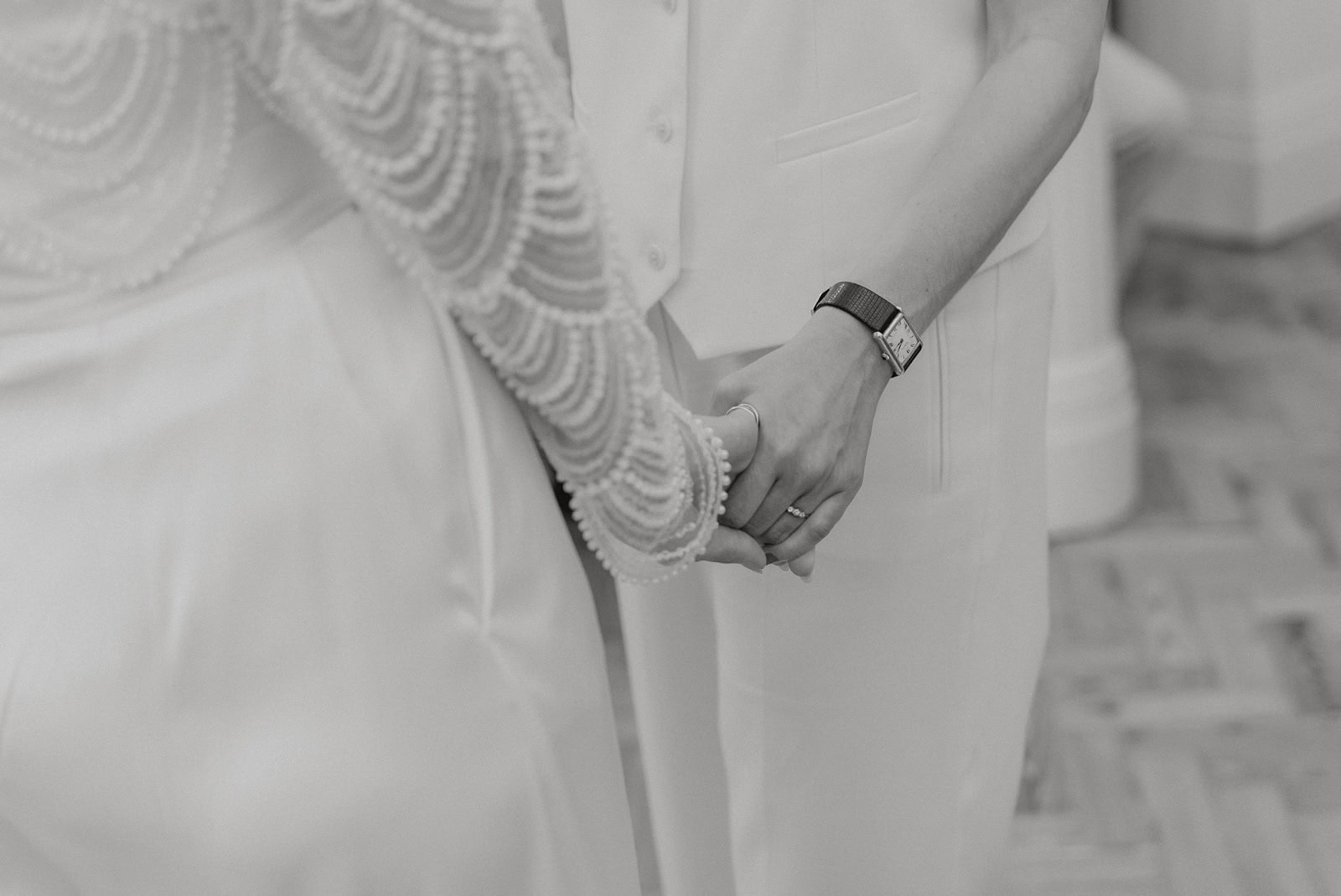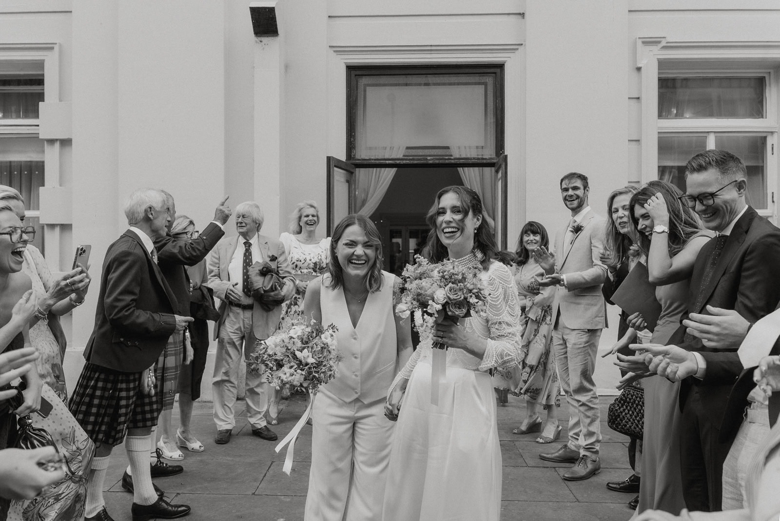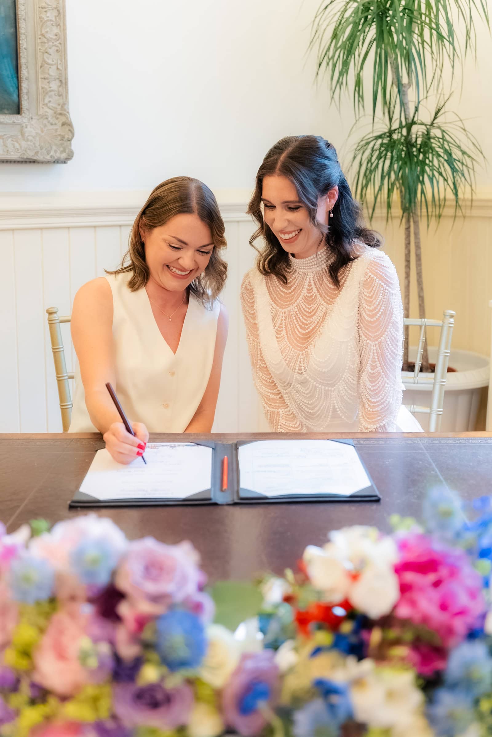 Laura & Olivia: Seeing each other walk down the aisle – Olivia with her Mum Gill, and Laura with her Dad, Andrew, was a beautiful and emotional moment. Walking out of the town hall with everyone throwing confetti at us and then proceeding to walk through the iconic Brighton Lanes as onlookers cheered and congratulated us was so joyful. Dancing together with all of our friends and family into the night drinking cocktails with many laughs and happy tears.