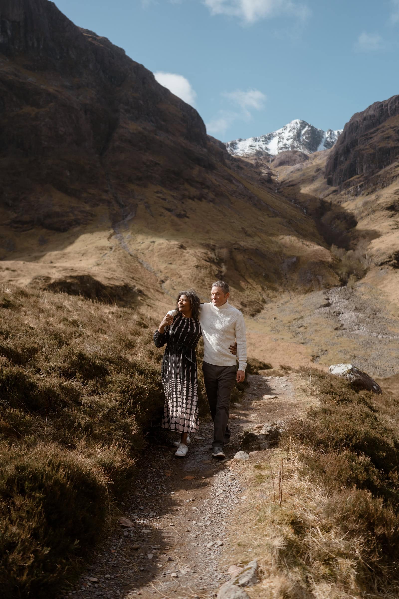 Ieva: Glencoe is absolutely beautiful all year round. If you want those gorgeous autumn oranges and reds, October is the best time to go. However, September is super beautiful too, as the green of the grass intertwines with blooming purple heather that covers most of the hills. Summer is gorgeous too, though I should warn you that in summer Glencoe (like most of the Scottish Highlands) is plagued by tiny but very bitey flying insects called midges which enjoy the hikers’ blood and their bites may leave you covered in itchy bumps for a few days if you do not take care to use insect repellents! If you visit in winter or early Spring, you are likely to see snow or at least snow capped mountain tops (like Dawn and Stuart had during their session).