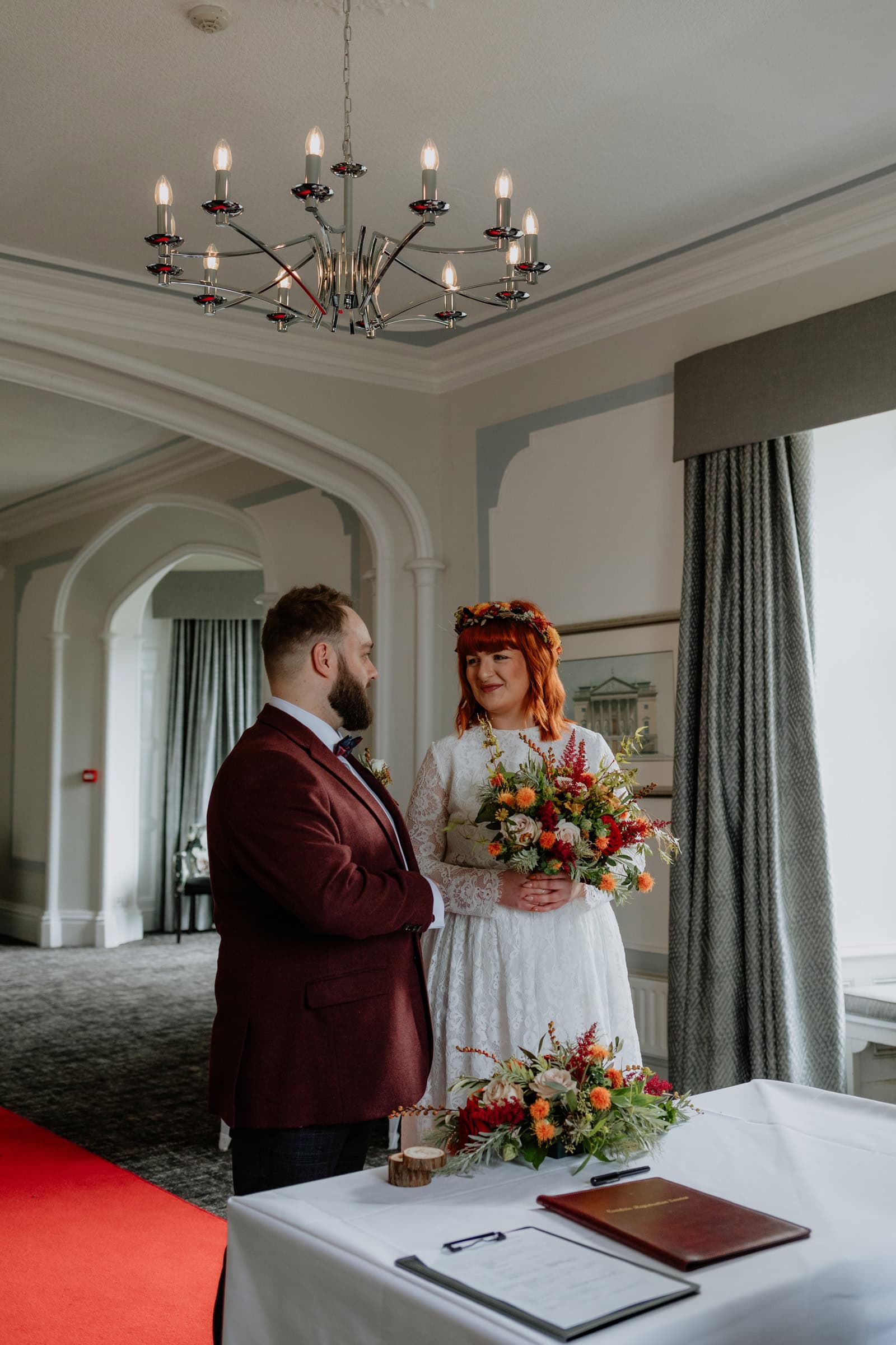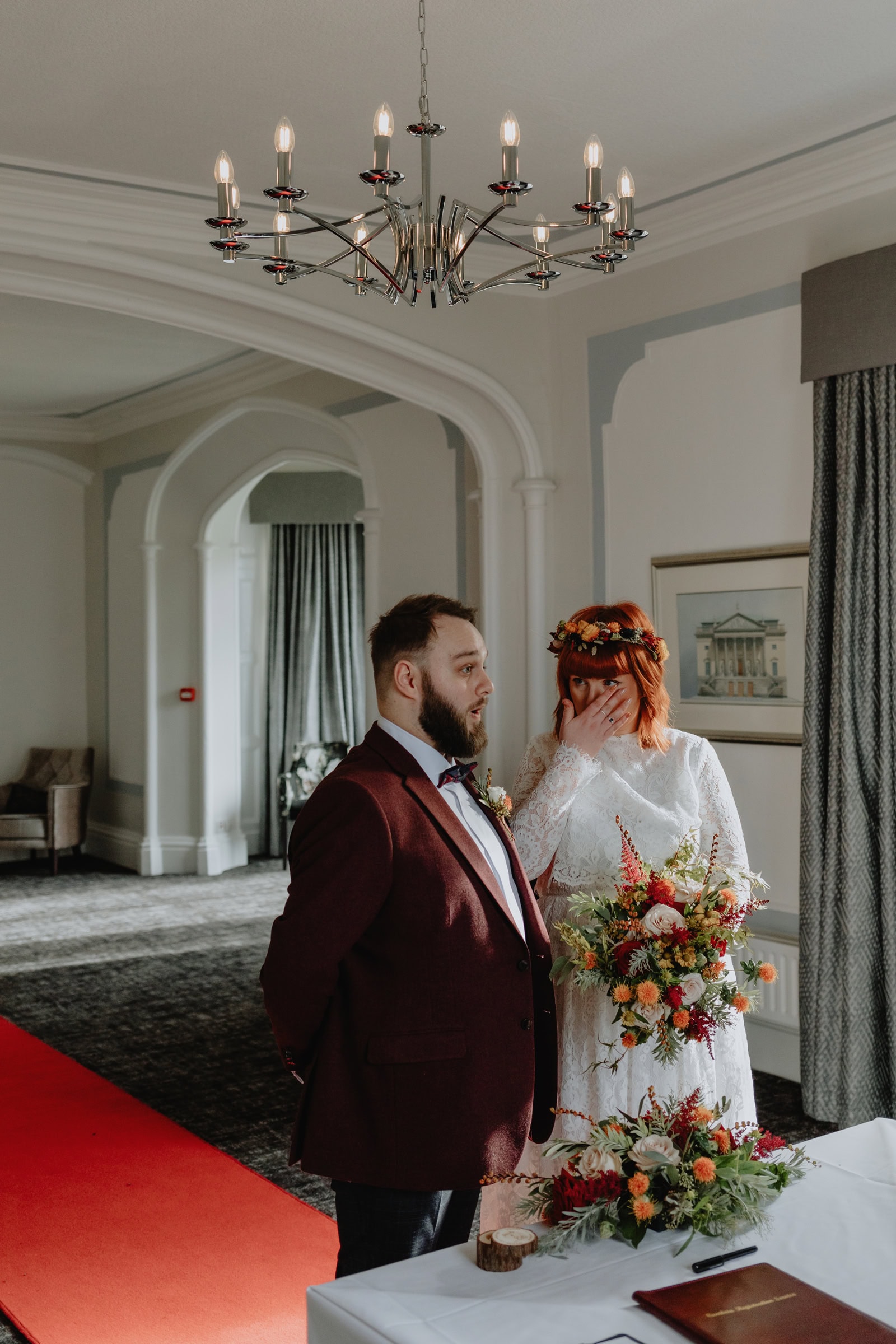 Jo & Jacob: Choose your season wisely, The place itself is stunning, but the autumn colours just made it perfect for us. I would recommend sturdy shoes for the photos so that you can get great photos in different areas. I wore Dr Marten boots. We picked the venue for the spa afterwards, it felt like the perfect way to celebrate together. Our photographer knew the lakes well too and knew the best places to get photos.