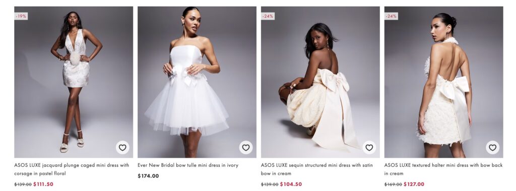Asos has a great bridal collection which includes some short dress options. They also have Asos Curve for plus-size dress options.