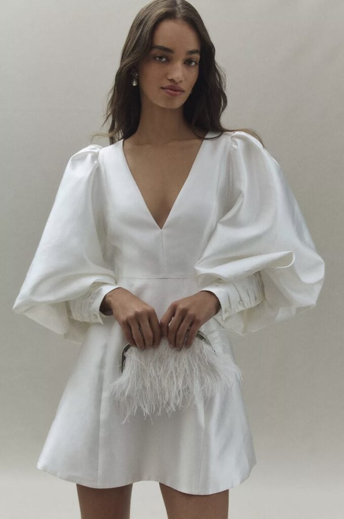 This structured mini dress blends classic drama with a clean, modern edge. The voluminous puff sleeves add bold personality, while the crisp taffeta fabric gives it a subtle sheen that photographs beautifully. Perfect for a city courthouse ceremony or a celebratory dinner, this is a short wedding look that feels playful but still polished.