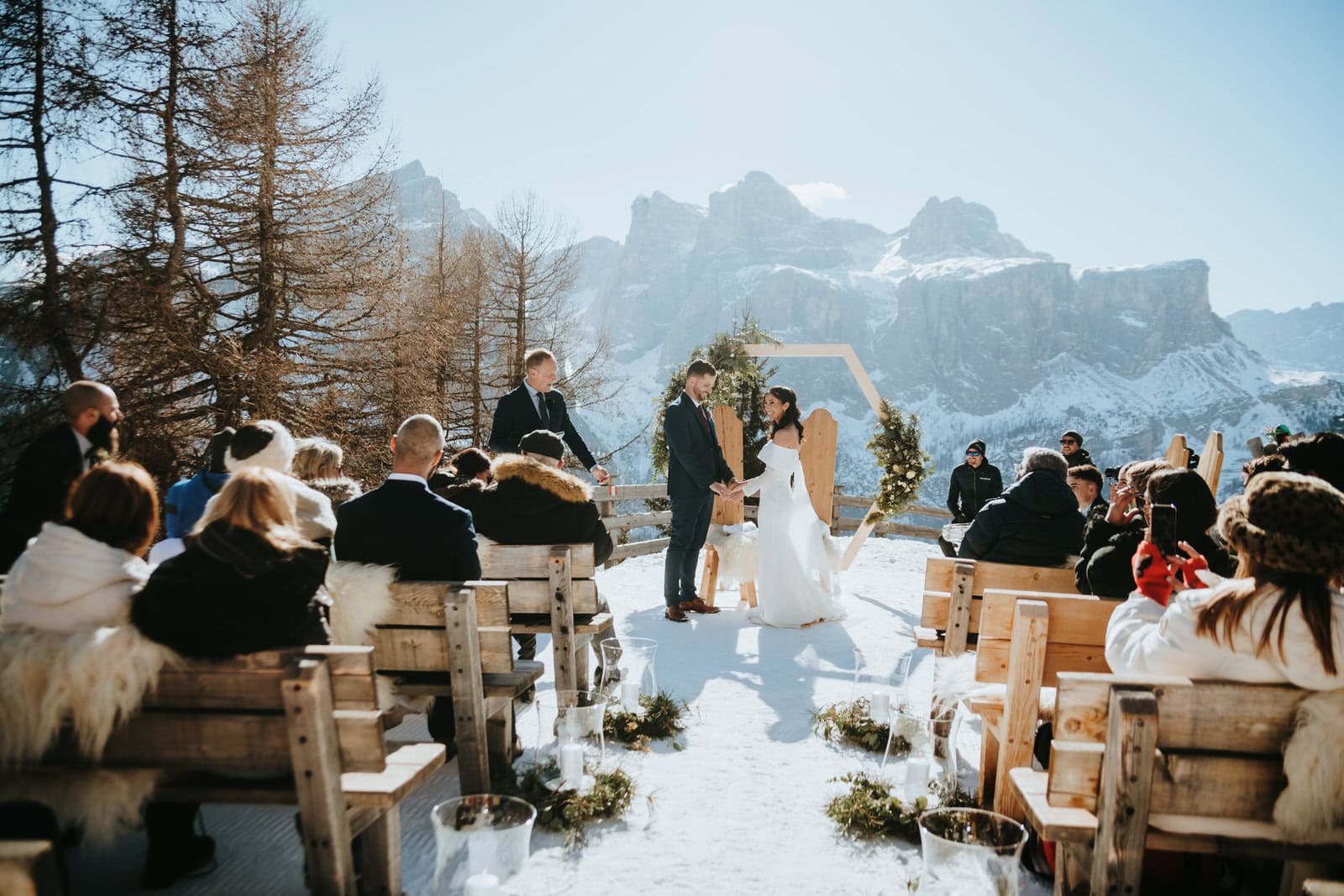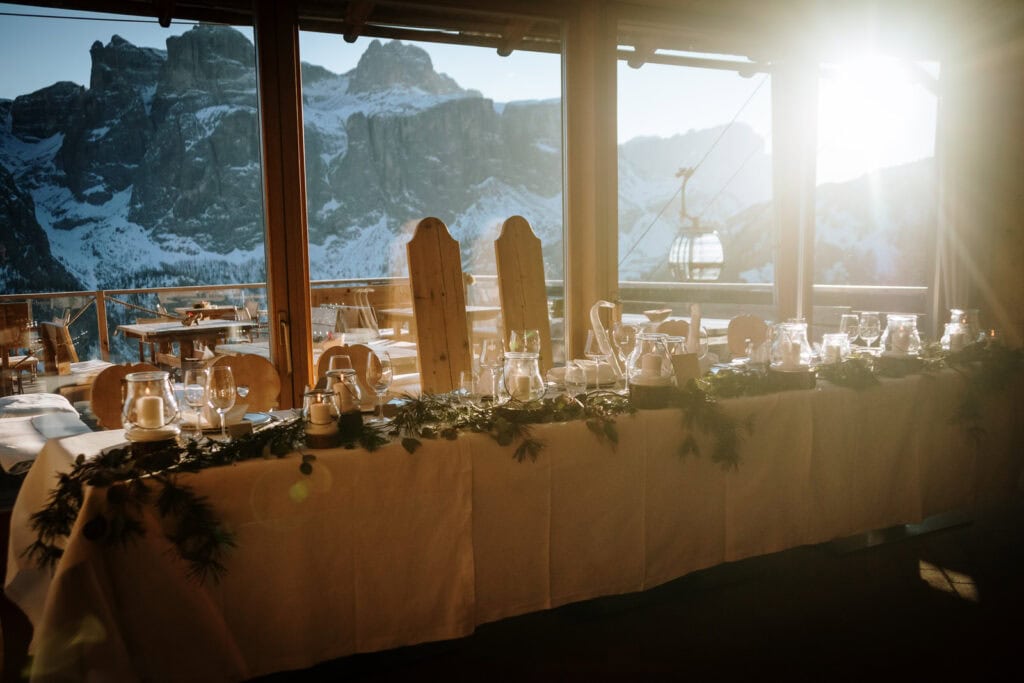 Accessible by cable car, Col Prasat is a mountain restaurant sitting above the village of Colfosco. It’s a popular location for both summer and winter weddings.