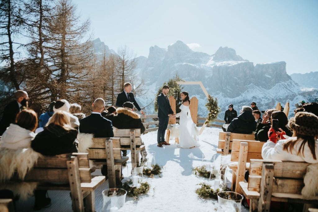 Set directly in front of the famous Cinque Torri rock formations. Guests arrive via chairlift for a ceremony in one of the world’s most unique landscapes.