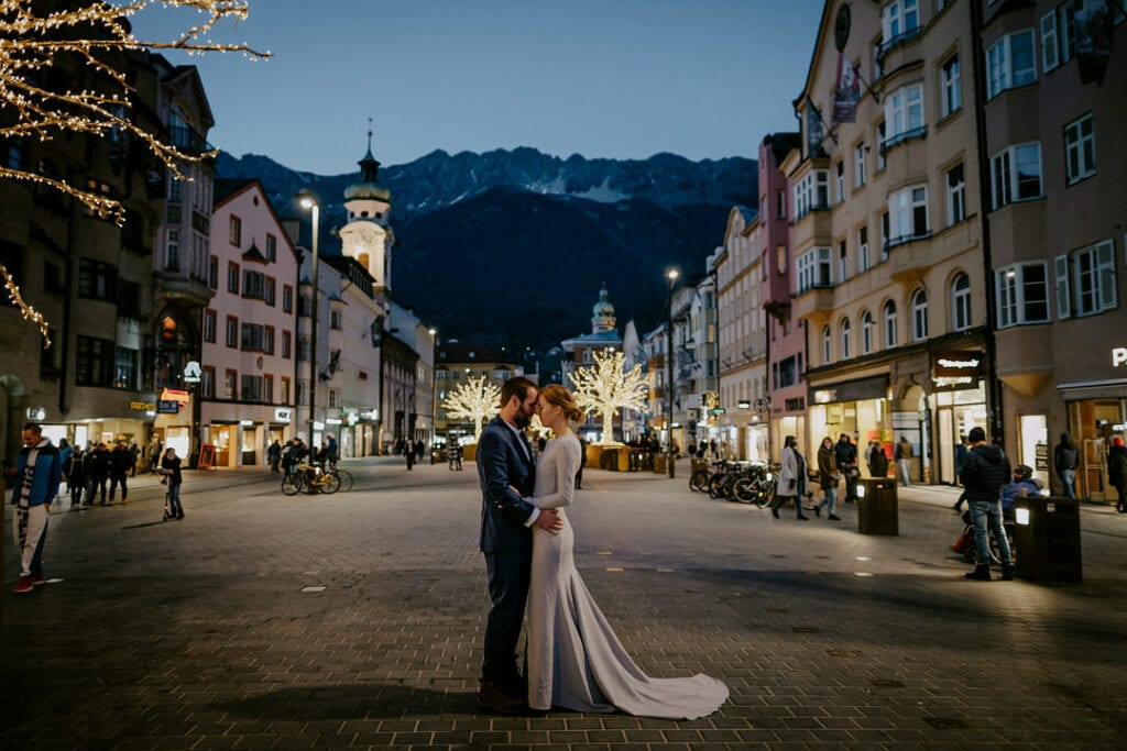 If you would like a Christmas markets elopement in Innsbruck, it’s important to be prepared for crowds, especially if you are visiting at the weekend. During the week they can still be busy, but less crowded than Friday-Sunday. If you want to take photos with the glow of the lights, but without total darkness, go around 3pm, as it’s dark by 4:30pm in December.