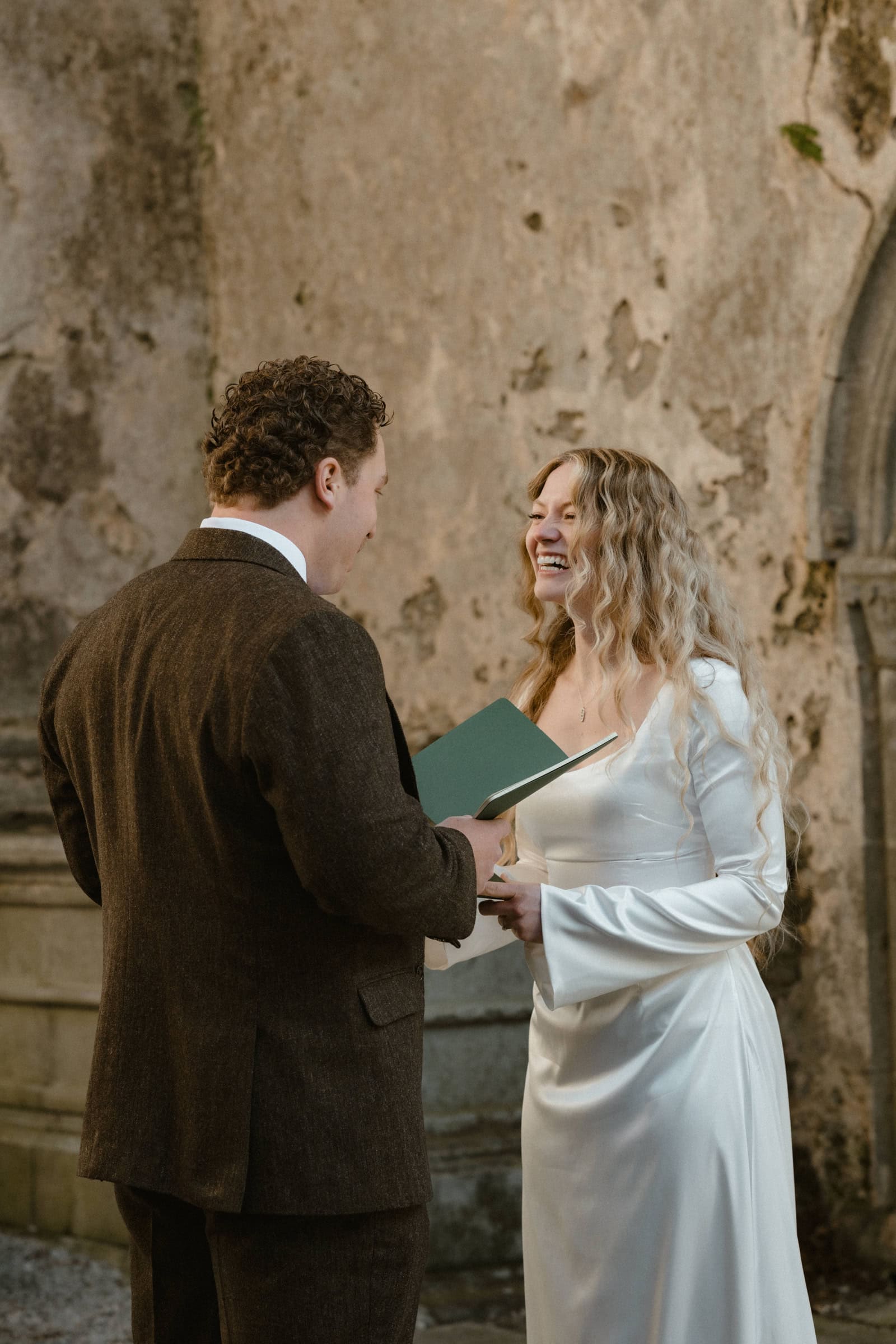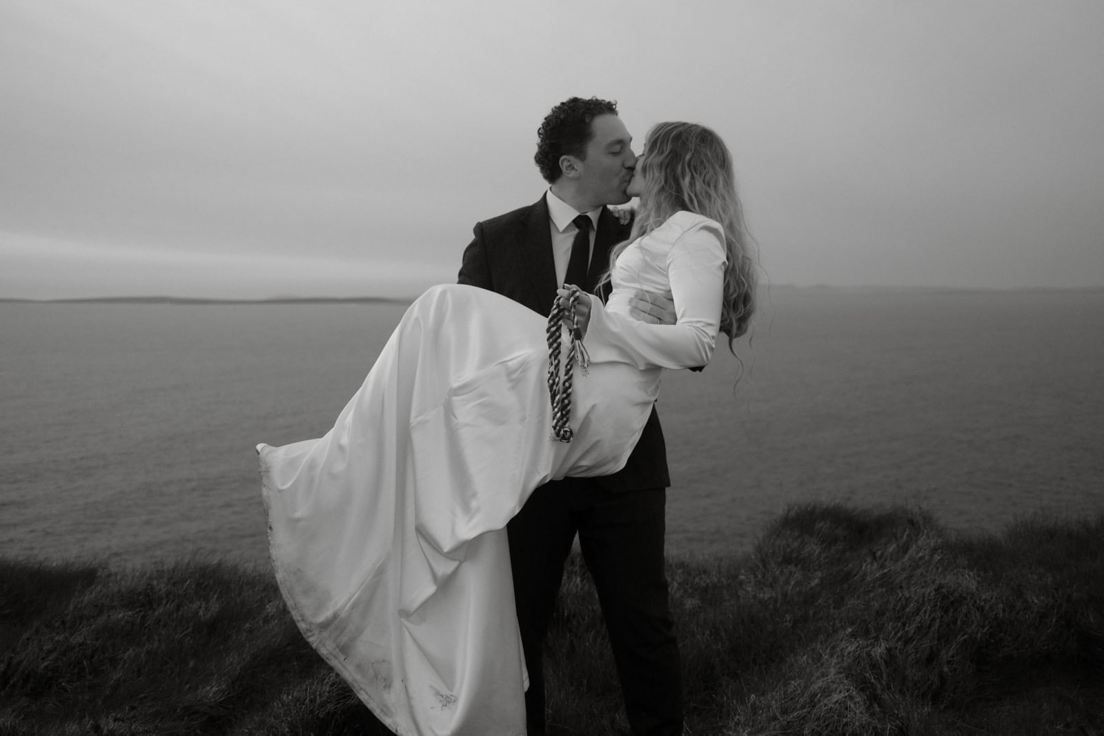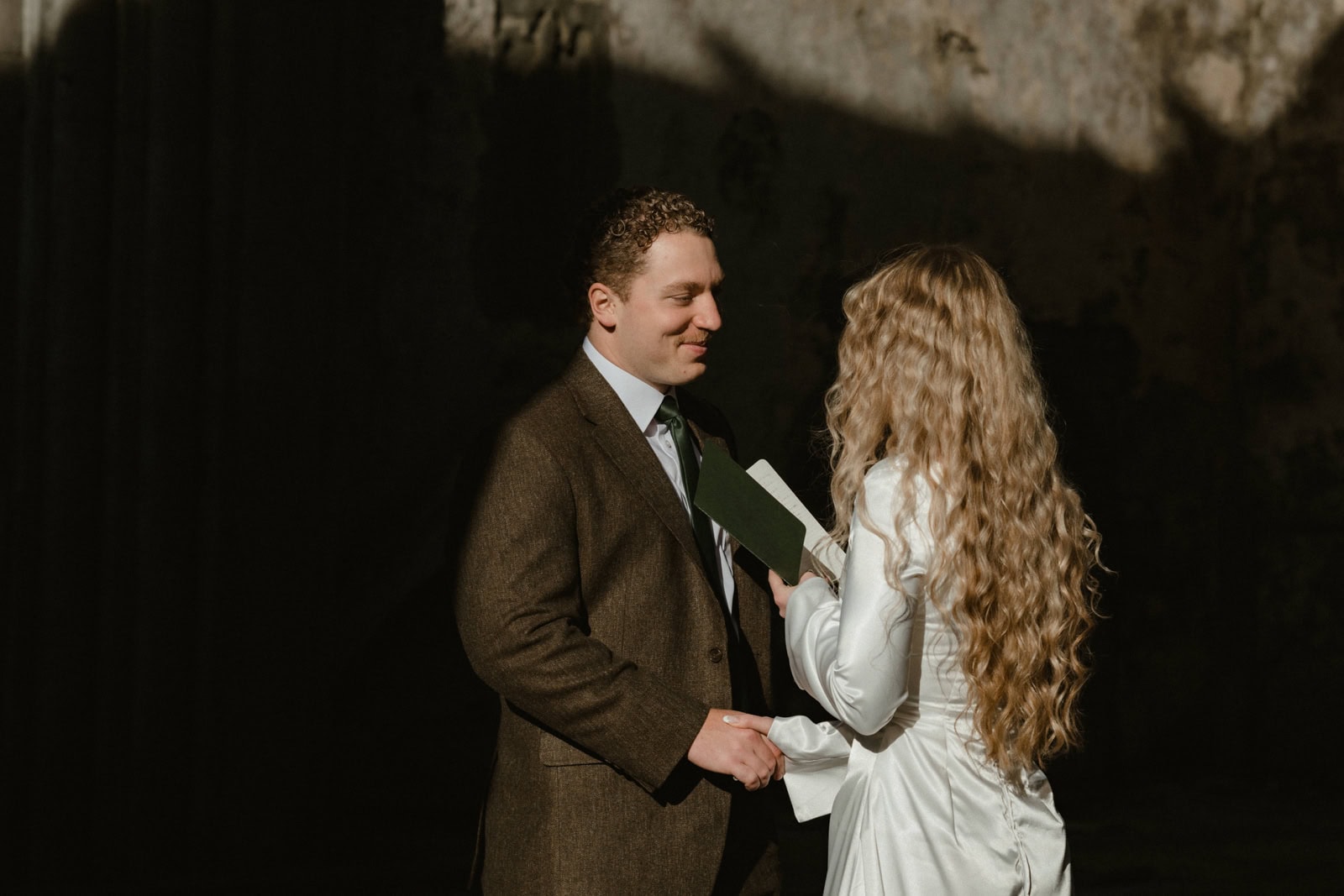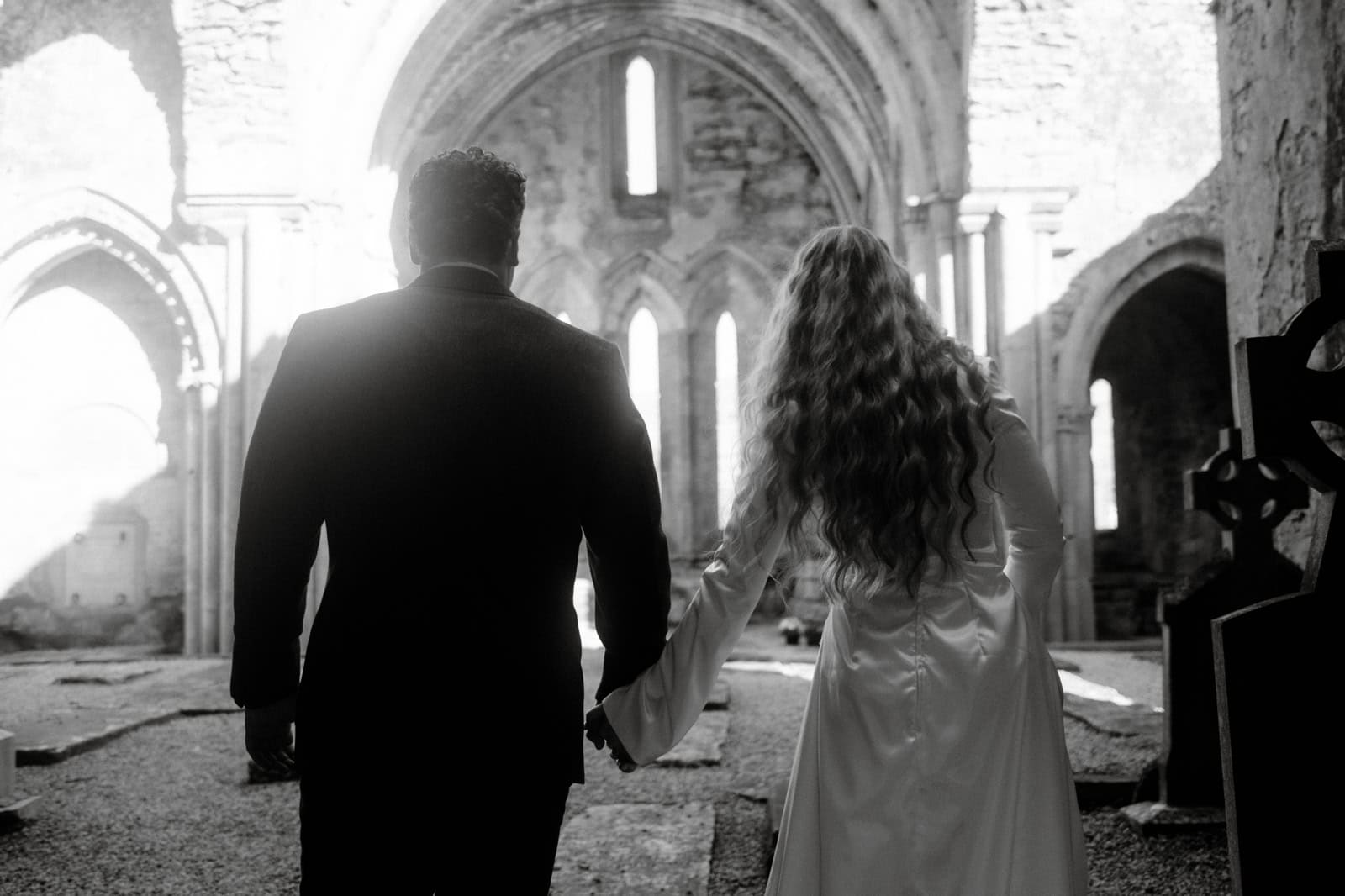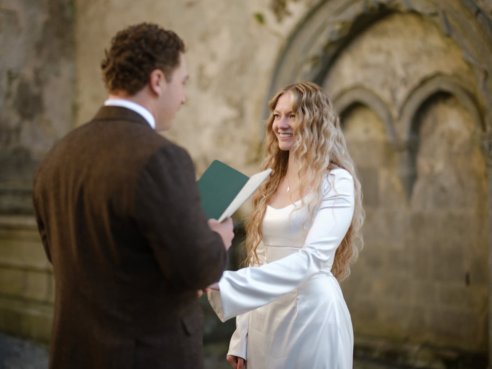 Cali and Sam flew to Ireland from Toronto to say their vows among the historical ruins of Corcomroe Abbey in County Clare. They then had an intimate handfasting ceremony at sunset on the Cliffs of Moher. A real life fairy tale elopement!
