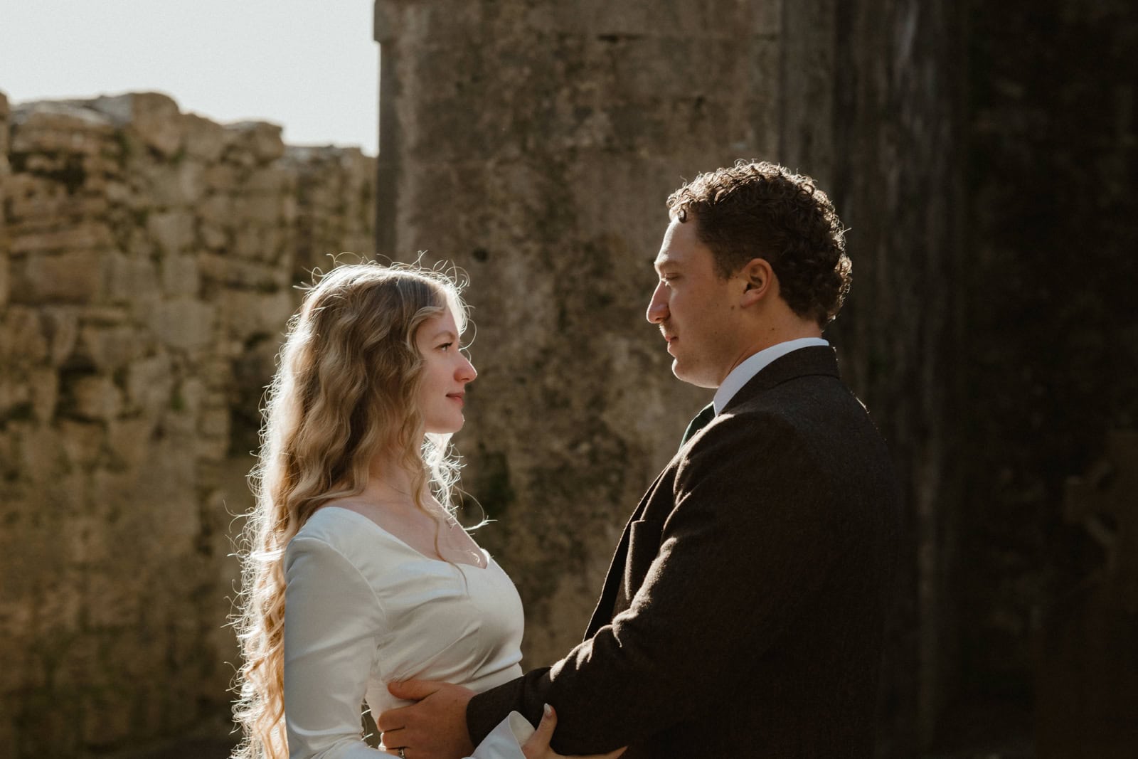 From Aideen, the photographer: For many visitors to Ireland, the Cliffs of Moher are one of the most anticipated outdoor destinations. Cali and Sam felt the same way! They also wanted to have photos taken at some old Irish ruins. I chose Corcomroe Abbey for our first location before going to the cliffs for sunset. The cliffs can be very exposed to the elements. The Abbey ruins provided a perfect, sheltered, intimate fairytale location for them to say their vows.