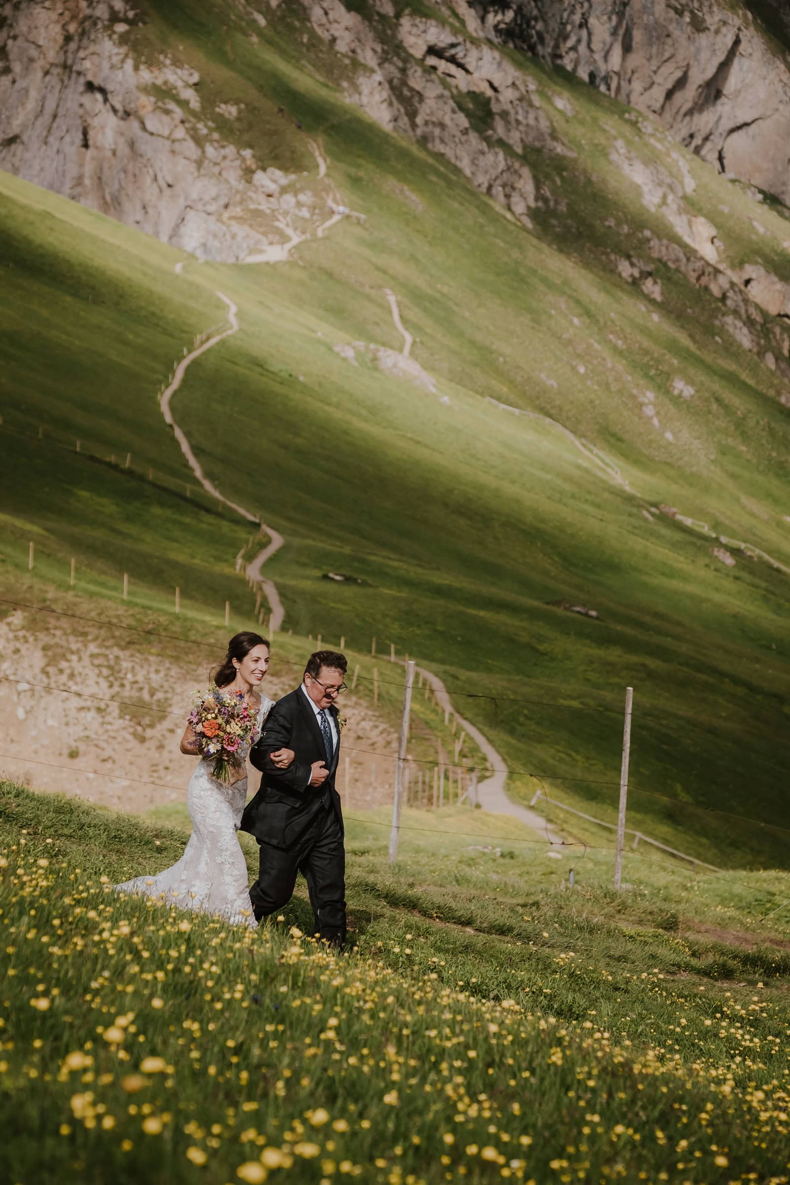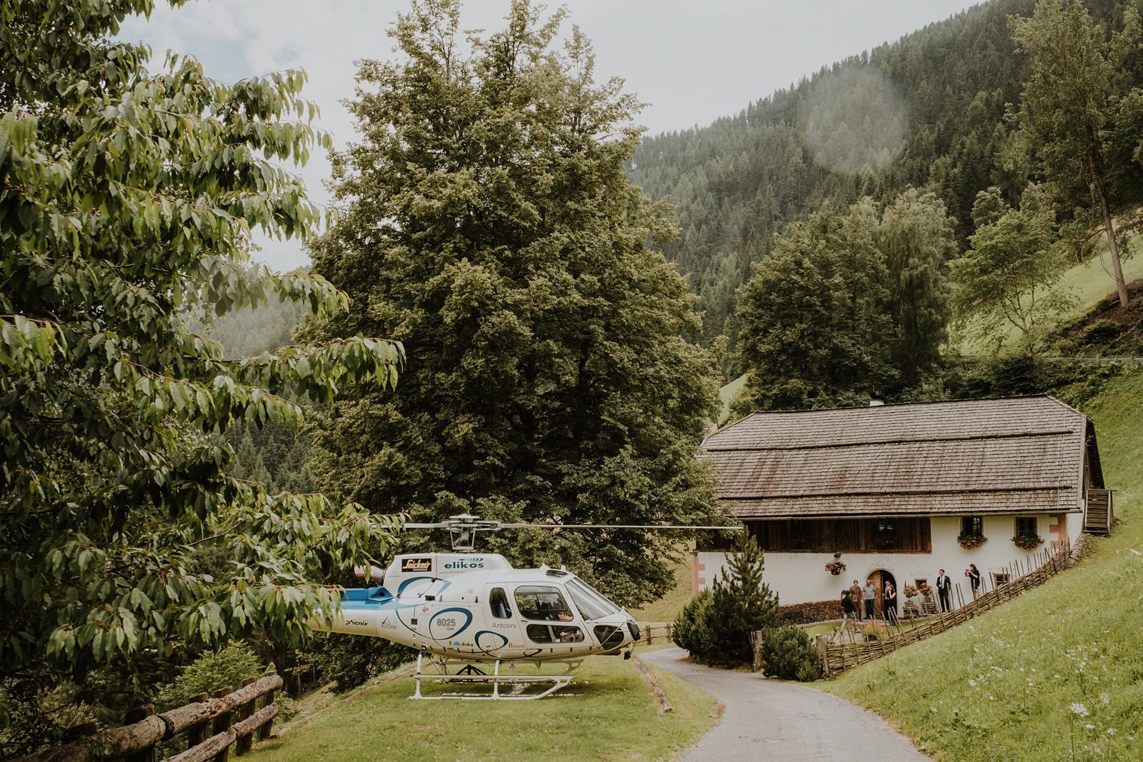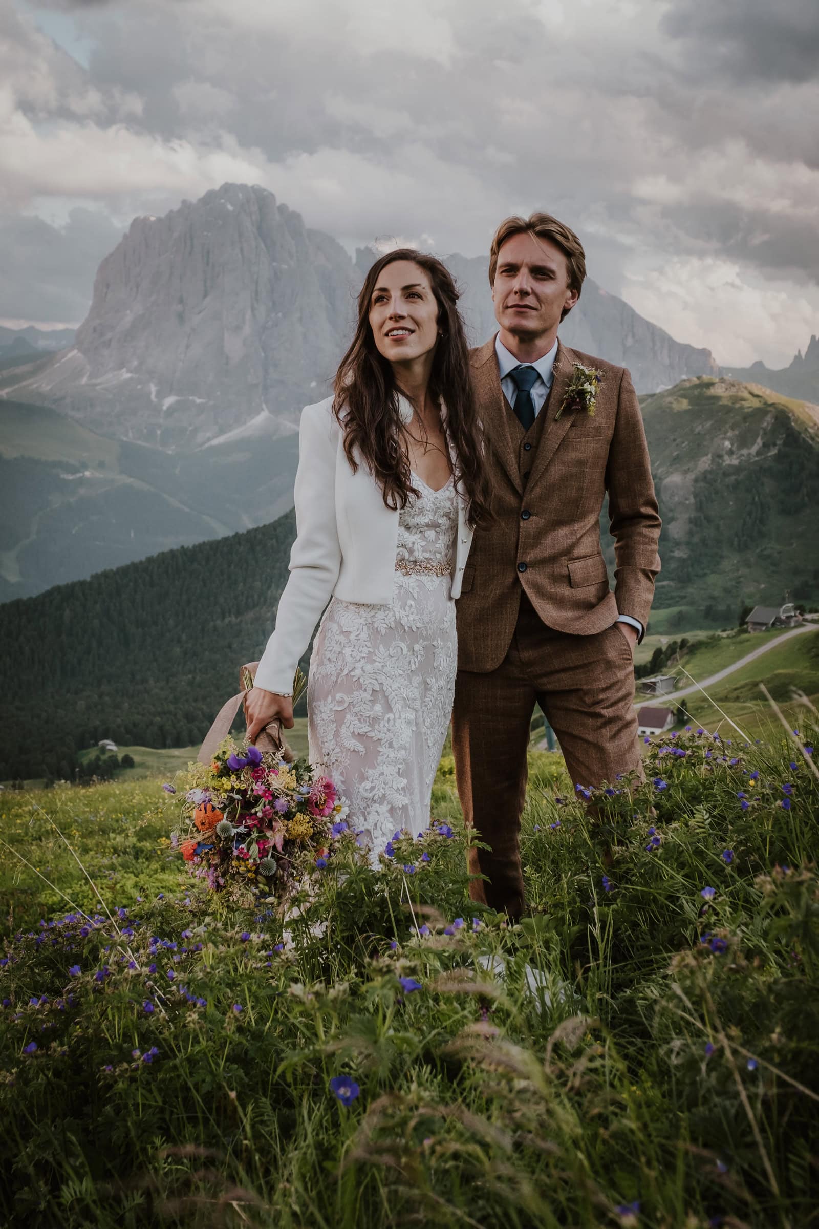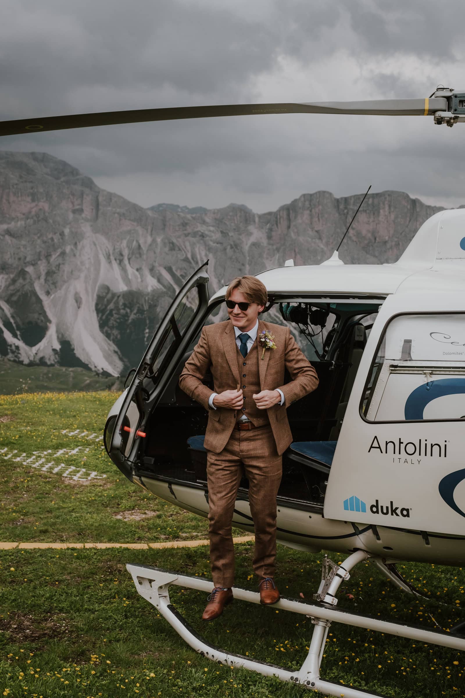 Megan & Christian had the idea of taking a helicopter to a stunning location for their elopement. They chose Seceda as their location for their intimate elopement ceremony because they fell in love with the green meadows in combination with the striking peaks and dramatic ridgeline.