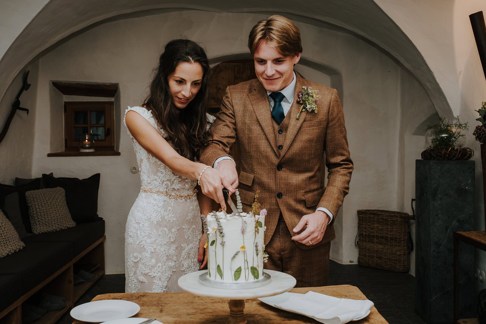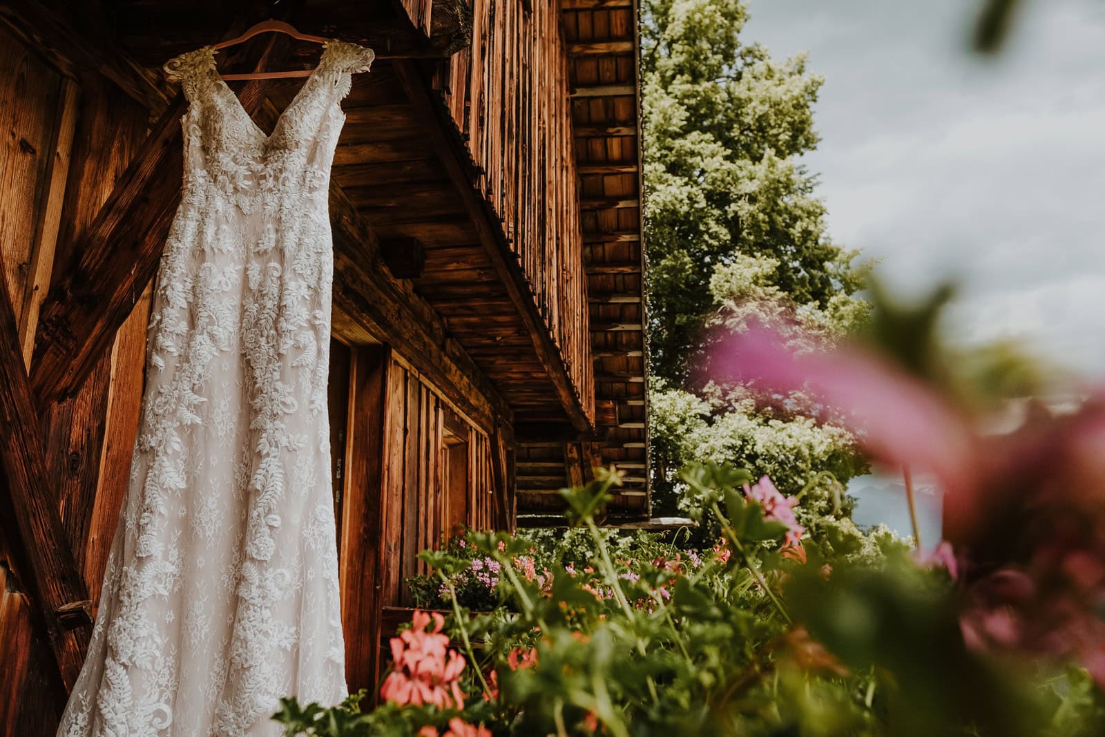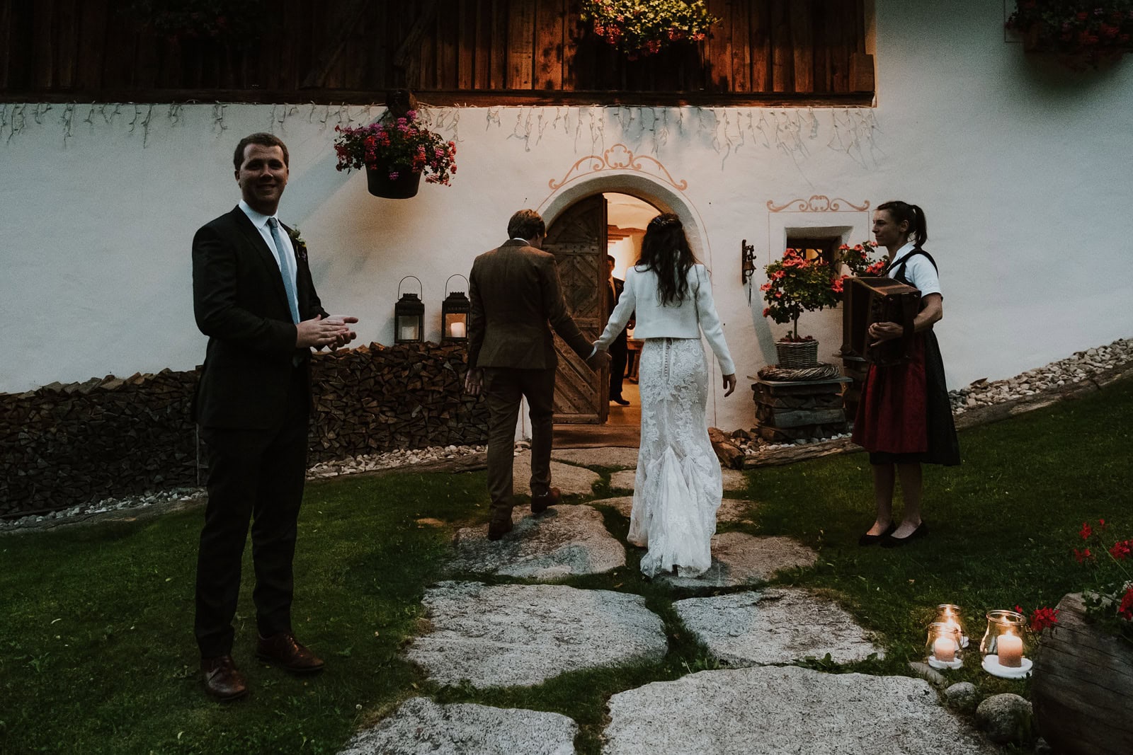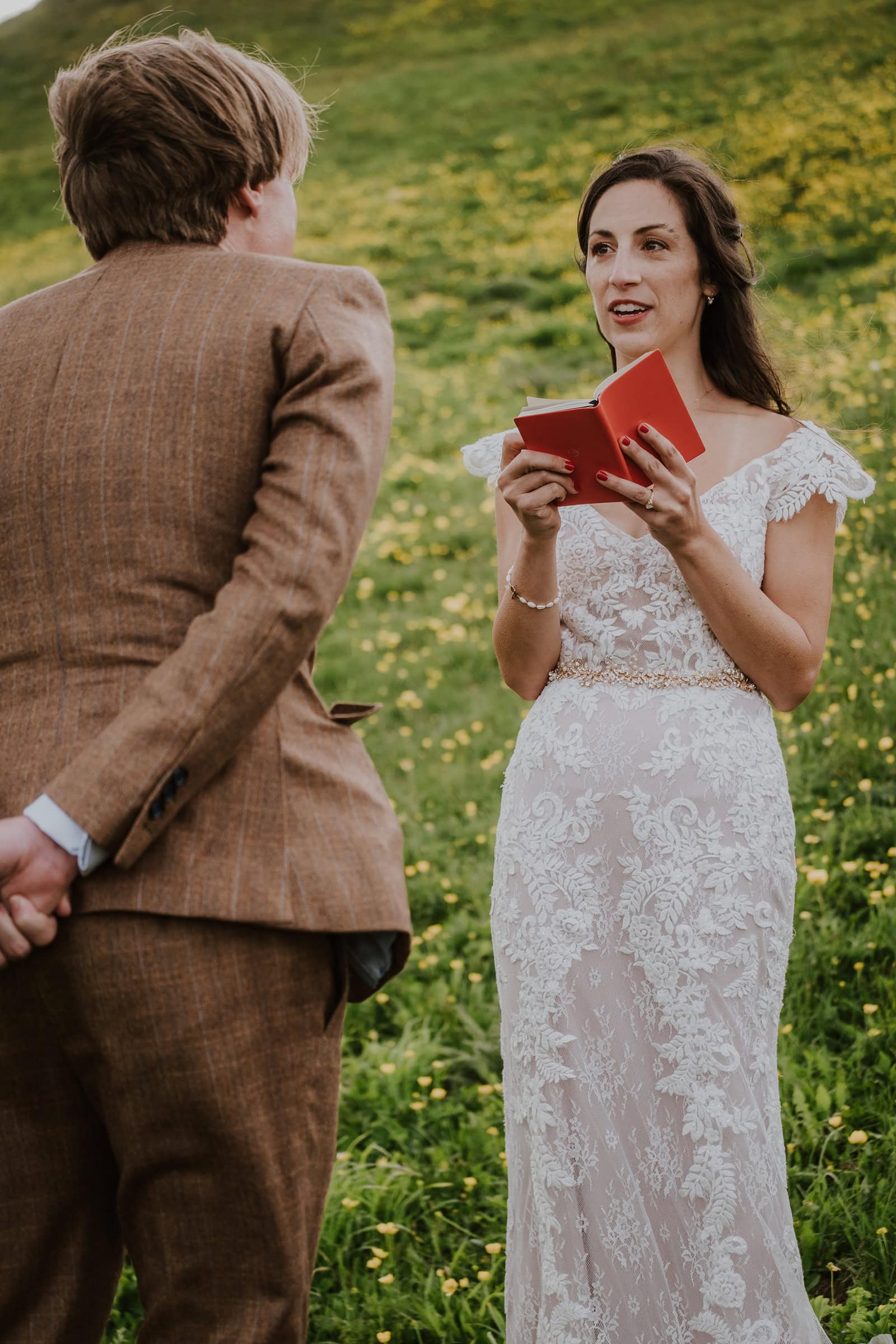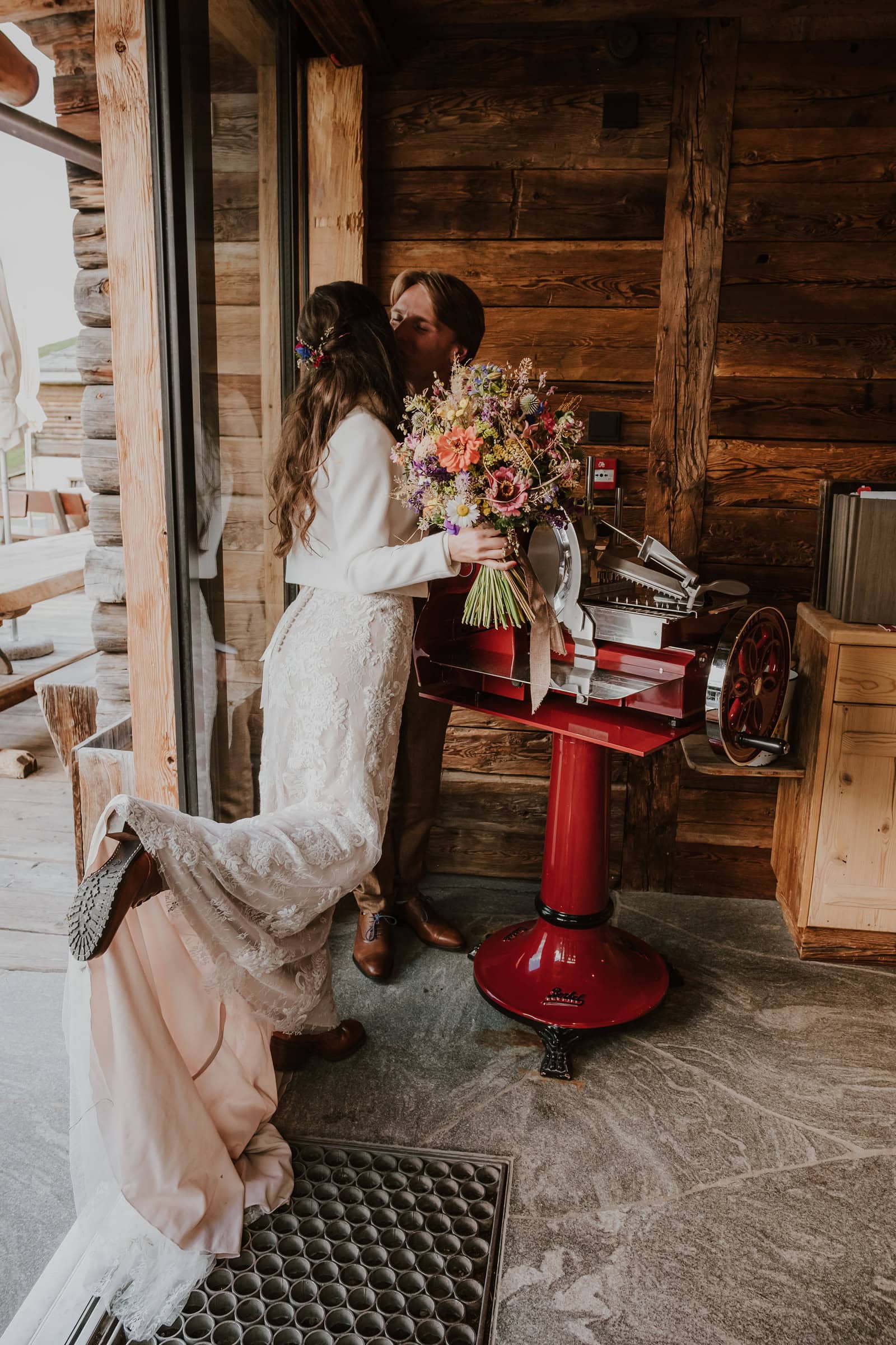 We wrote our ceremony and were our own officiants, so the program and readings reflected our precise vision. The afternoon was utterly gorgeous (I mean stunningly picturesque), and we cultivated such a special and intimate moment. The vows were astonishingly powerful. Sitting down for dinner while listening to the traditional Alpine music, seeing the flowers from our bouquet hanging above us, and smelling the insanely delicious meal being prepared for us was unreal.