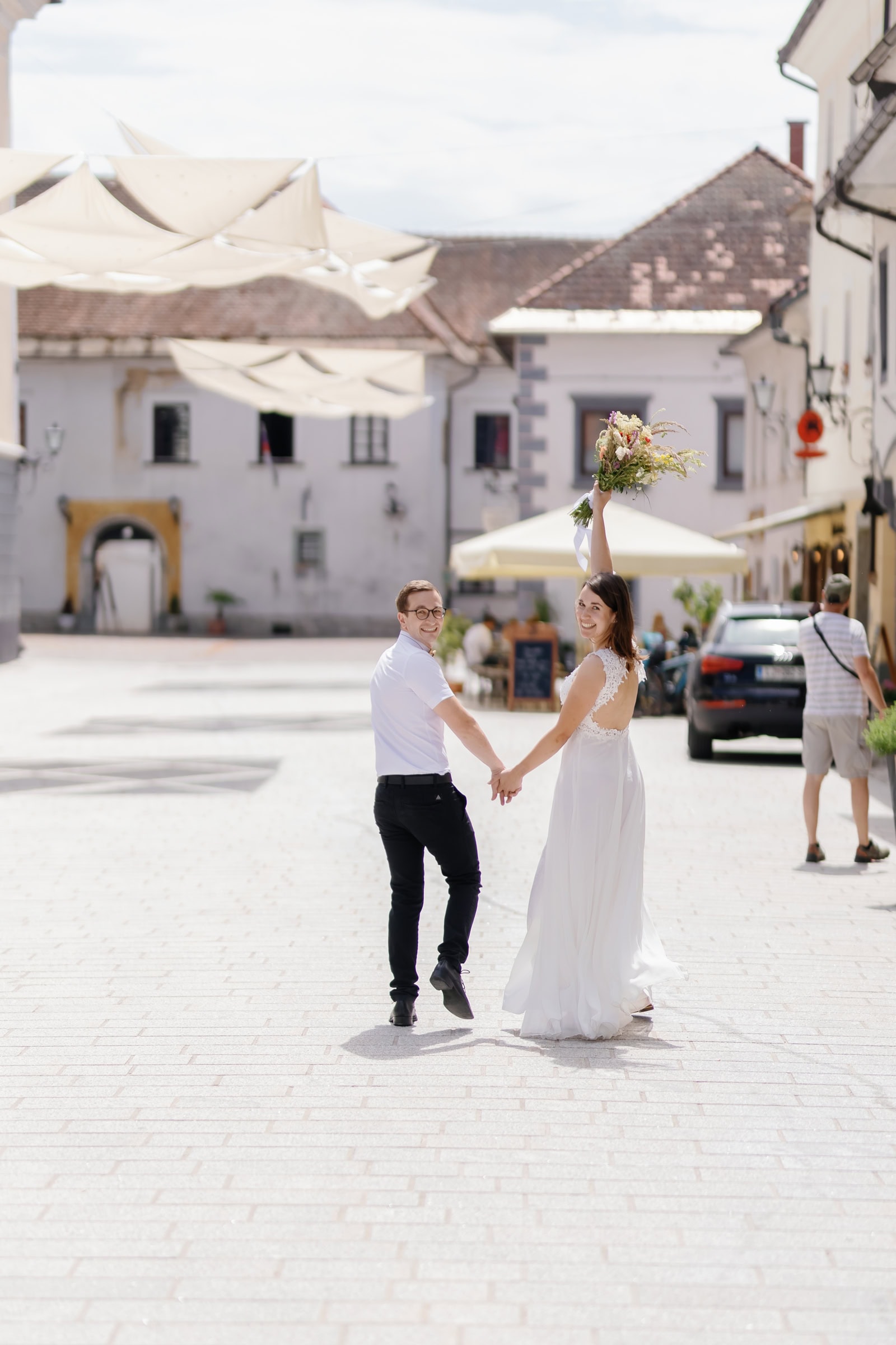 Exactly one year before their “big wedding” day, on the same date, Klara & Tadej eloped to have a full day just for them. They exchanged their vows at the town hall of Radovljica, where they also signed their official marriage certificate. They then did a bit of a walk through the old streets of Radovljica before heading for “wedding pizza” lunch.