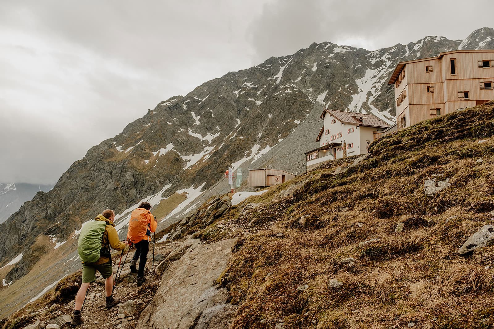 Their elopement spanned across three days. On the first day they got legally married at the registry office in the Pitztal Valley. The next morning, we met up early at the trailhead and hiked to the mountain hut where we would all sleep that evening.