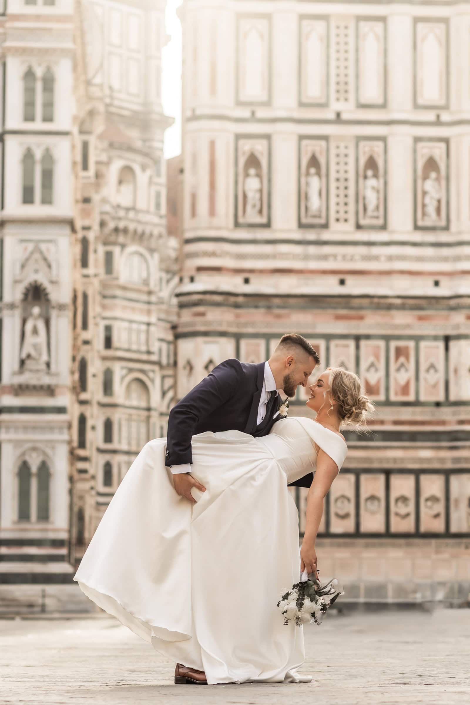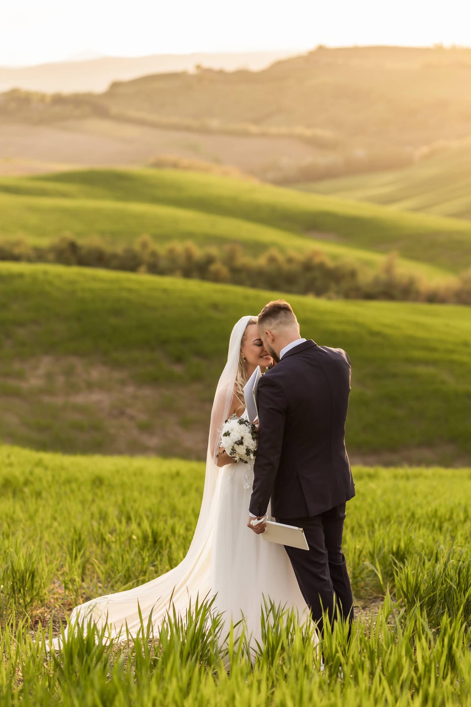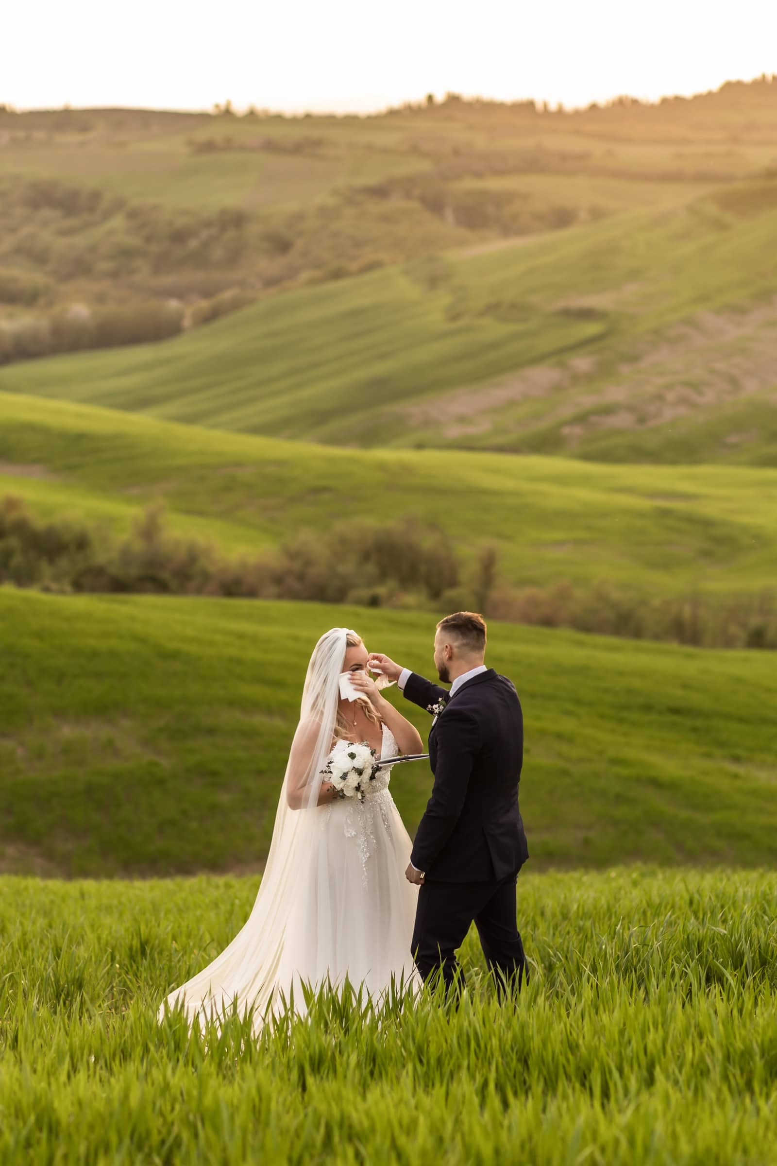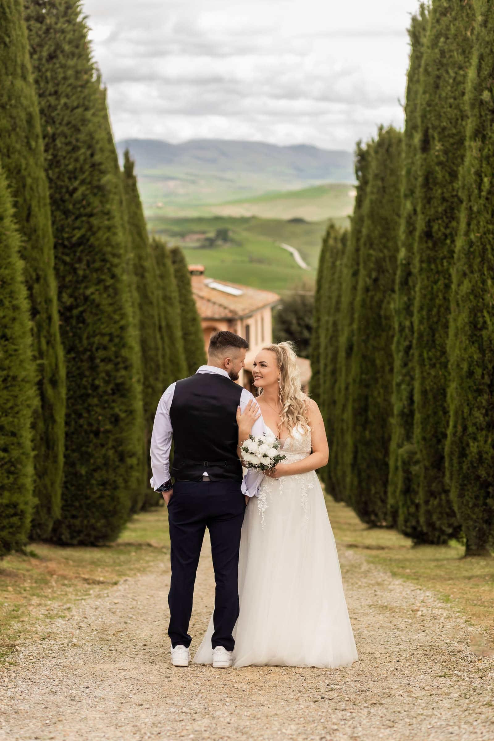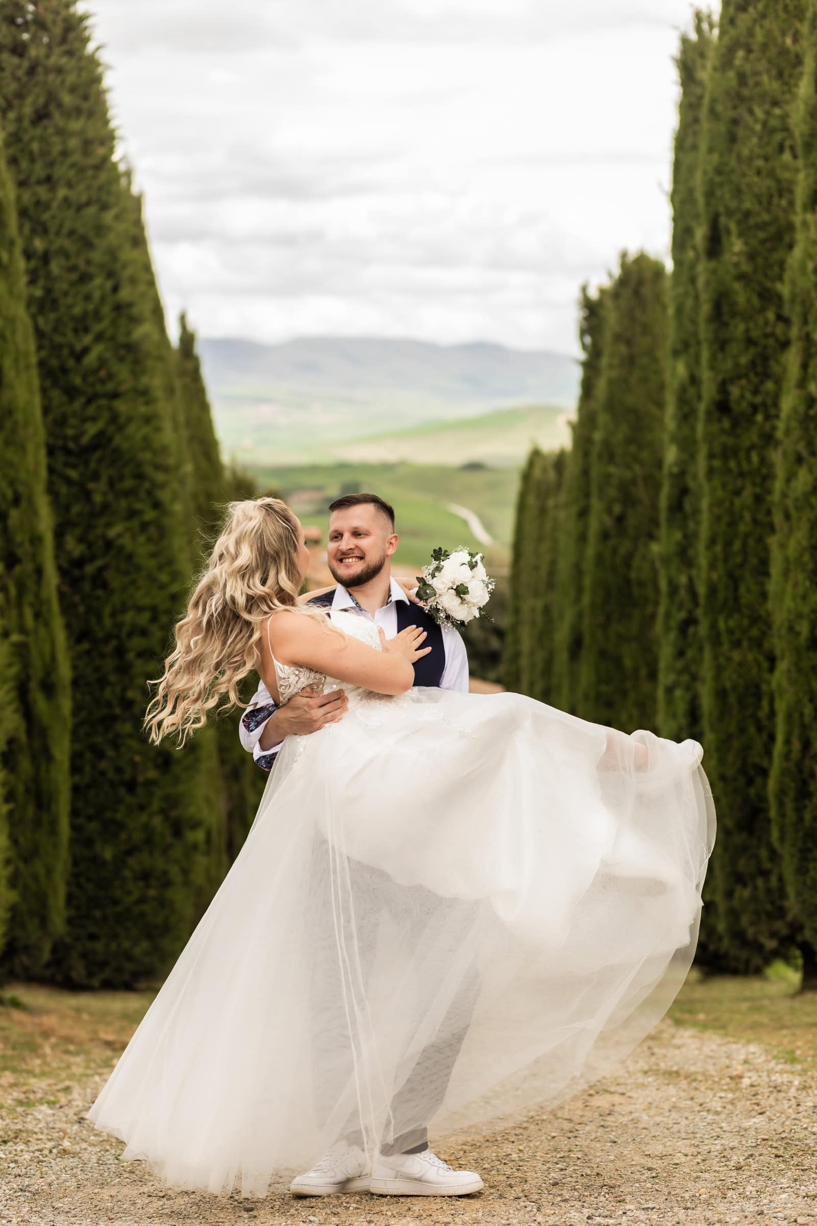 They started at sunrise in Florence, where they took portraits in front of the Dome and then started wandering around on the cobblestone streets. They had an ice cream break that somehow turned into face smearing 🙂 They moved on to a little beautiful town in Tuscany called Pienza, where they also had lunch. Having pizza in Italy in their wedding gown was one thing they definitely wanted to do! Then they explored cypress streets in Tuscany, visited the spot where one of the last scenes of Gladiator was filmed (groom’s special wish) and finished the day with the most beautiful sunset ceremony in Tuscany. A lot of tears, a lot of emotions and AMAZING views!