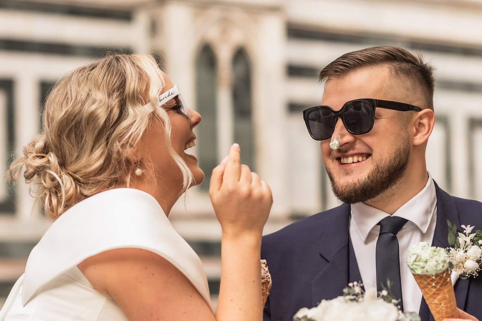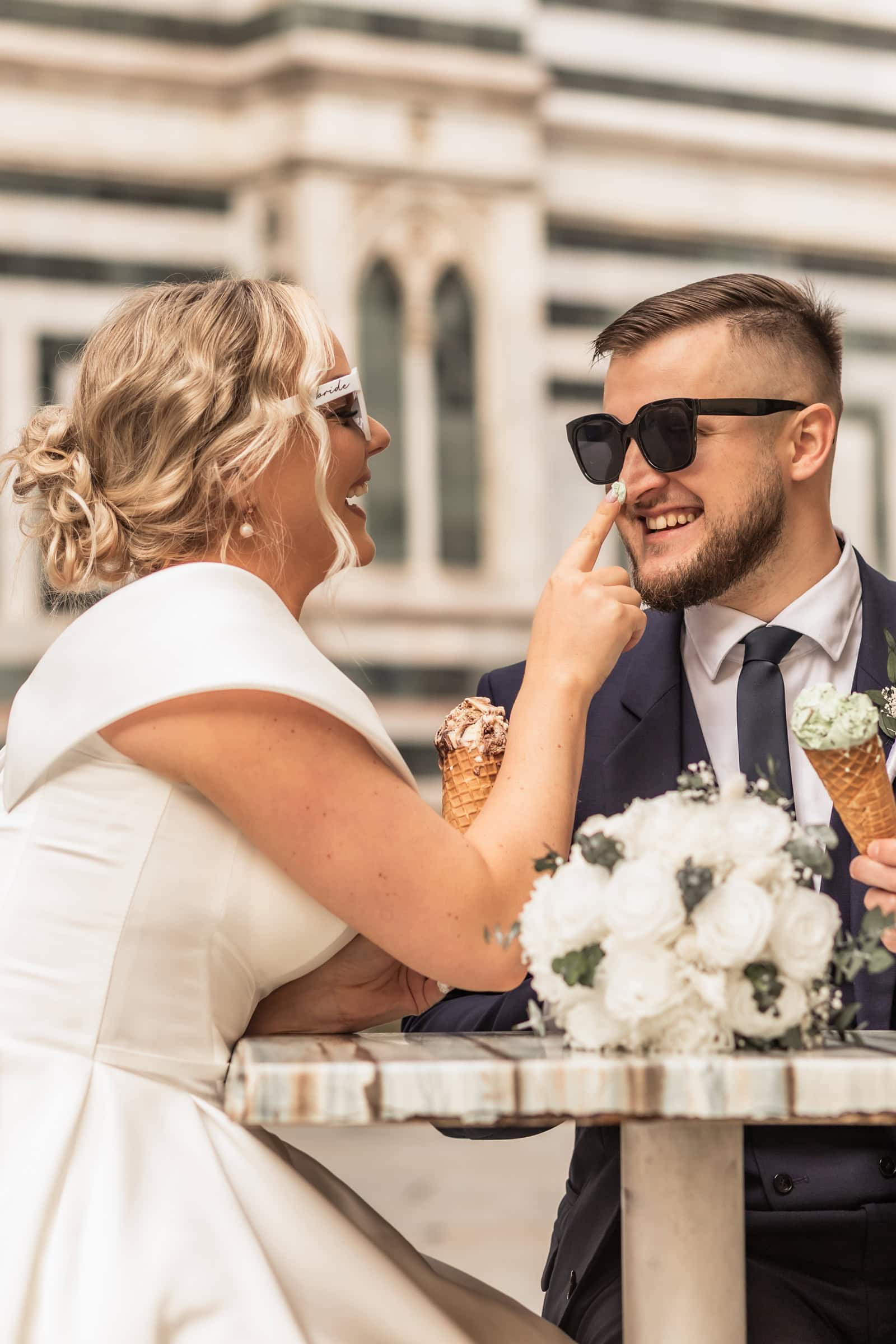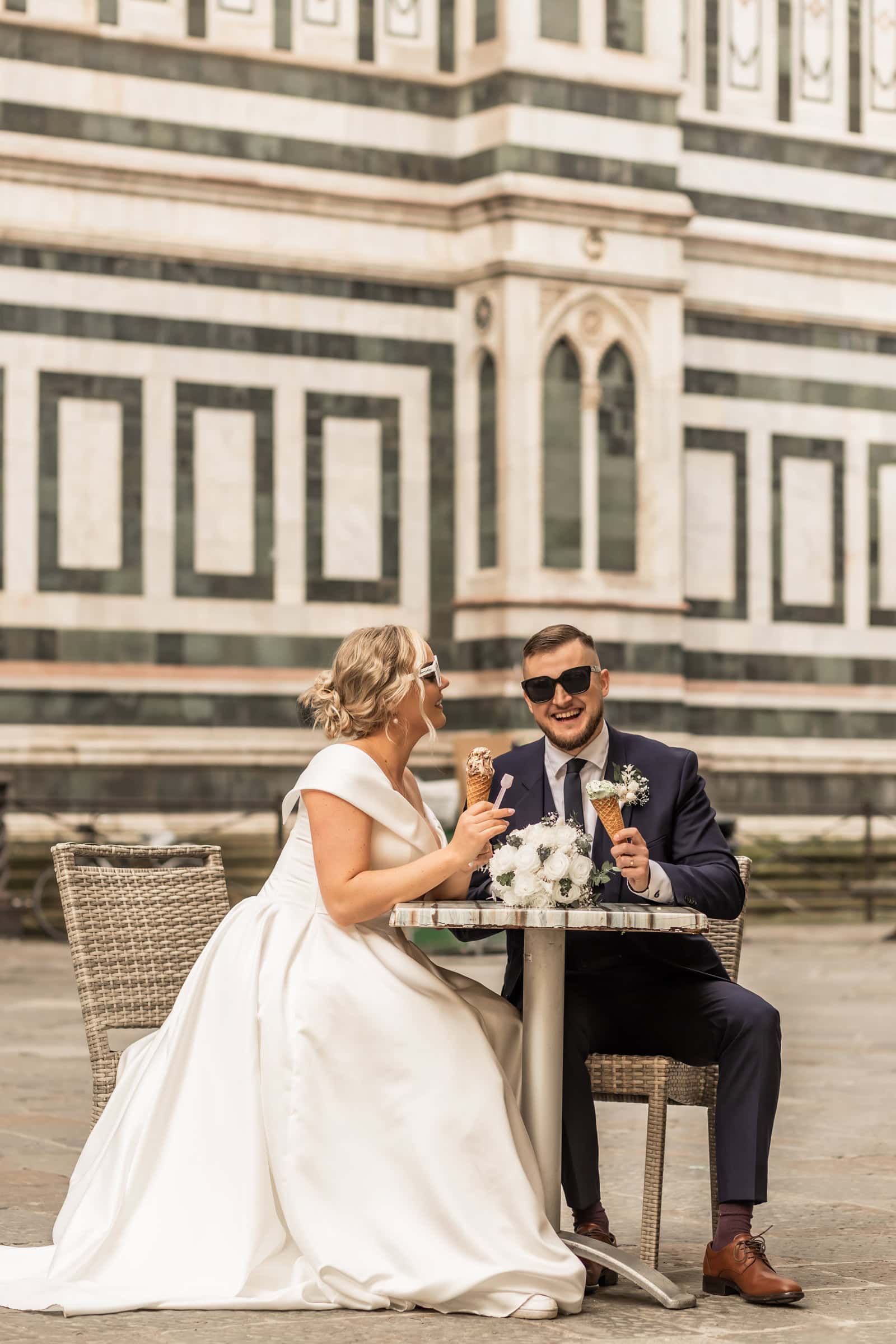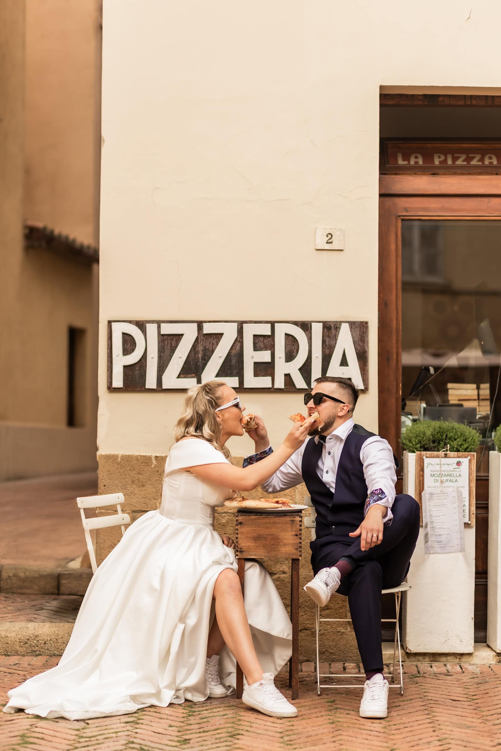 Monika & Riho: Eating Italian pizza in our wedding gown is something we definitely wanted to do. We sent some inspo-pictures to Eva when we started planning. And we had our pizza break in Pienza and Eva captured those fun, chill moments. We also had a spontanious gelato break in Florence.