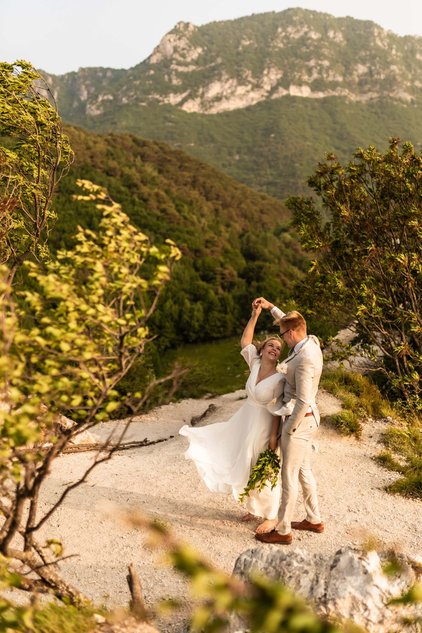 Kaisa & Laur: The day was so beautiful from start to finish. It is hard to narrow it down to just a couple of things! The ceremony of course was emotional! The hike in the morning was adventurous and spectacular. The viewpoint had an amazing view and the sunrise on this morning was very unusual (more orange looking). The boat ride that my friends had organized for us was such a surprise and actually one of the most relaxing parts of the entire day. There was just us, the driver and Eva. Nobody else around for two full hours and we cruised around on the lake, relaxing, sipping champagne. We had a bubble machine fun on top of another mountain in the afternoon and this was very us. We also read letters from our family and friends while we were there. Eva had them handwritten into a little notebook for us. In the evening we hanged out on the docks, listening to music, dancing our first dance. The best possible end for this beautiful day!