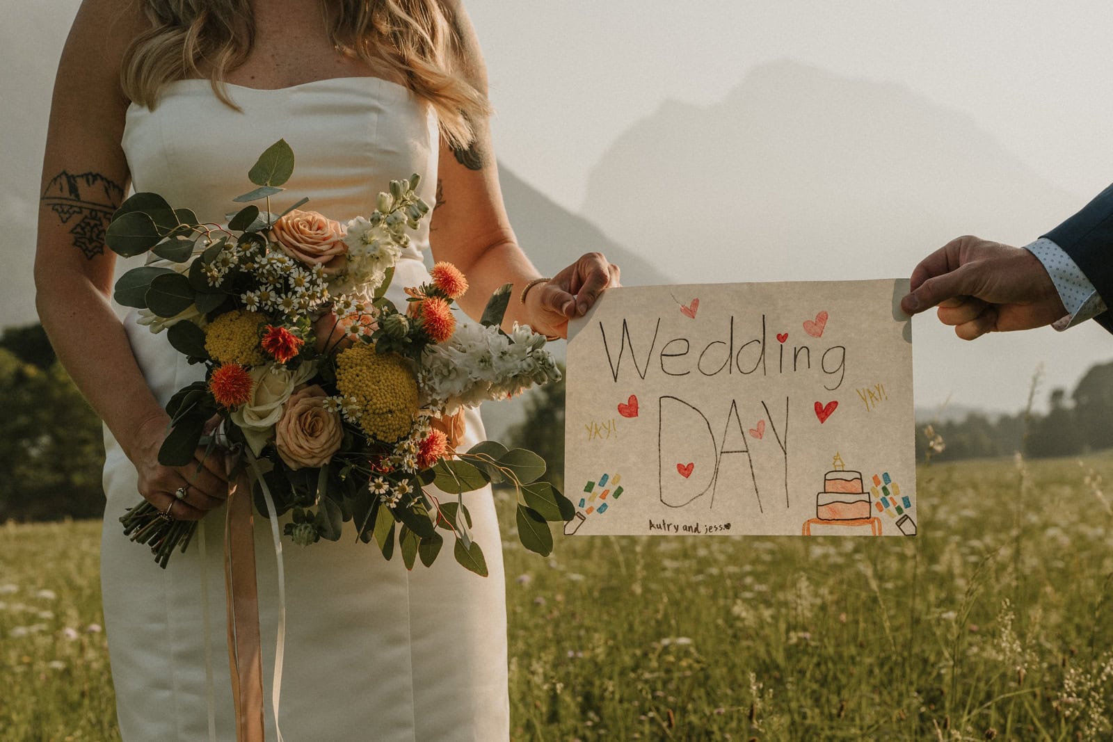 Jess & Autry: We had custom tennis balls ordered for a photoshoot idea we had, and even went so far as to find and book a tennis court so we could stage a photoshoot early in the morning on the elopement day. We also brought a ‘wedding day’ sign, made by Autry’s daughter for us, which was captured at all of our photo locations throughout the day.