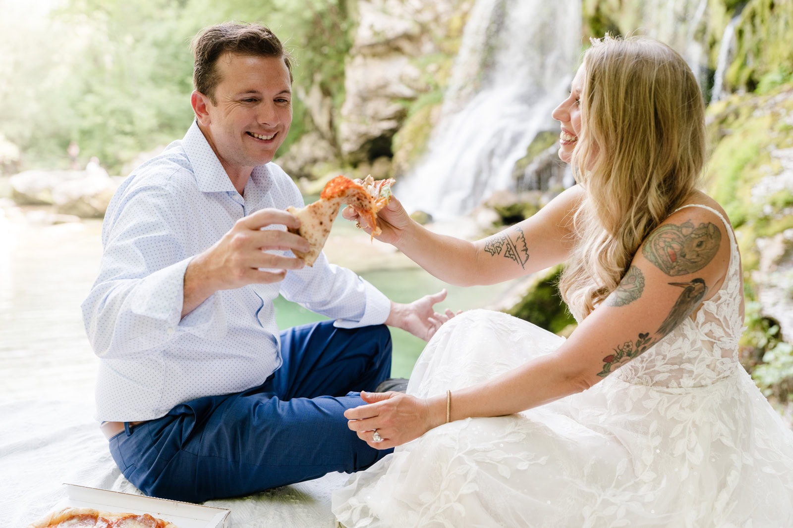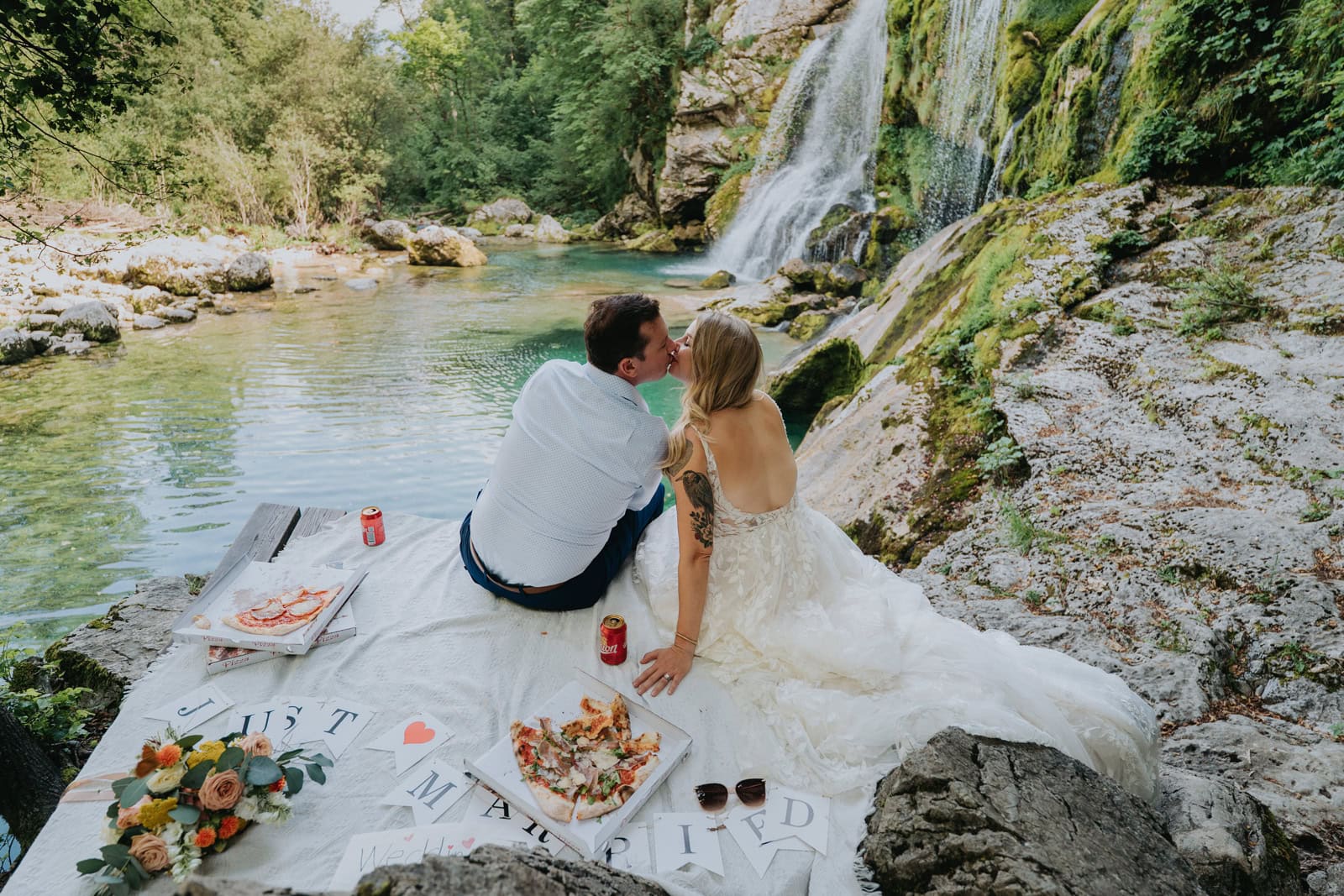 Jess & Autry: Mangart Saddle, our original location for the elopement, was still closed due to winter conditions or a lack of debris clearing, which was saved by our photographer who immediately knew of an equally stunning location within the same general area. Additionally, it was abnormally hot during some of our trip, and we needed to manage sweat and overheating during our full day photoshoot and ceremony. We ended up cooling down at a local waterfall with pizza and Union beer where it ended being one of the most magical parts of the day, and of course made for amazing photos.