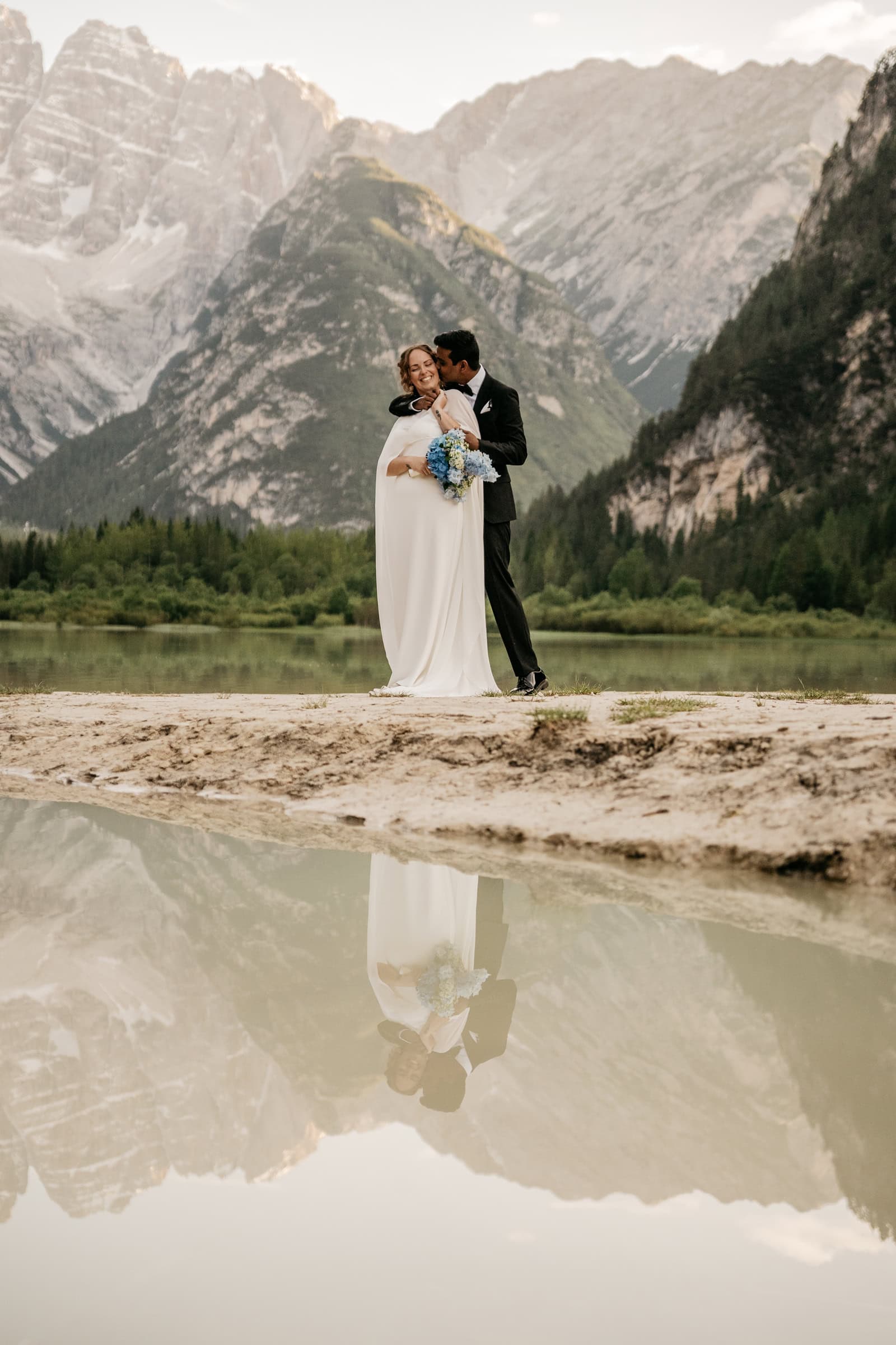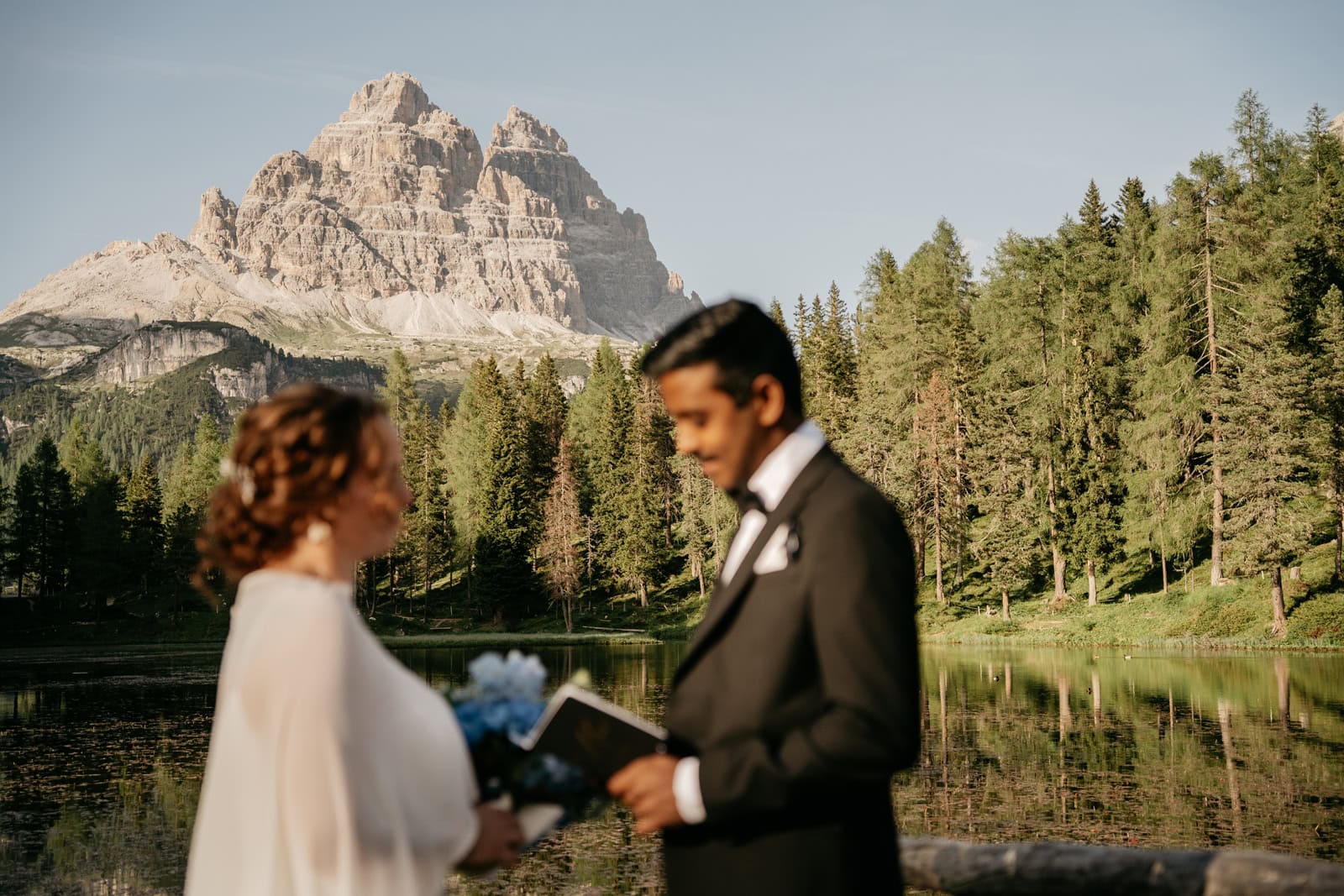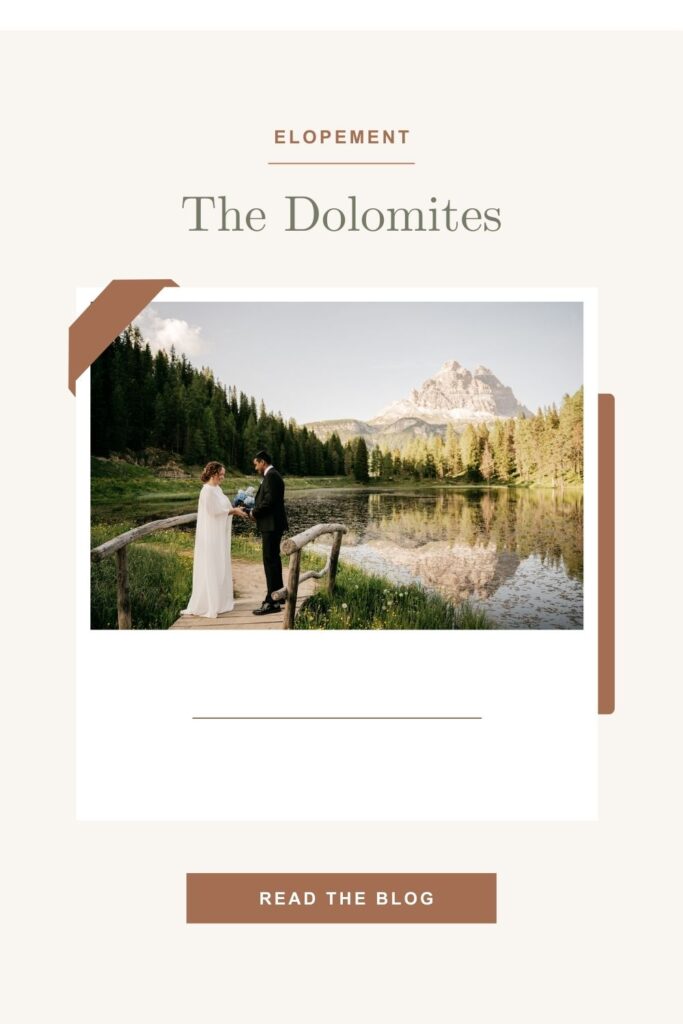 This Elopement in the Italian Dolomites is about two best friends – once coworkers, now soulmates – and they choose the Italian Alps to celebrate their love. It was simple yet deeply meaningful, magical, and entirely their own. They explored two quiet lakes in the Dolomites, exchanged vows at sunset, and let the mountains be their witness.