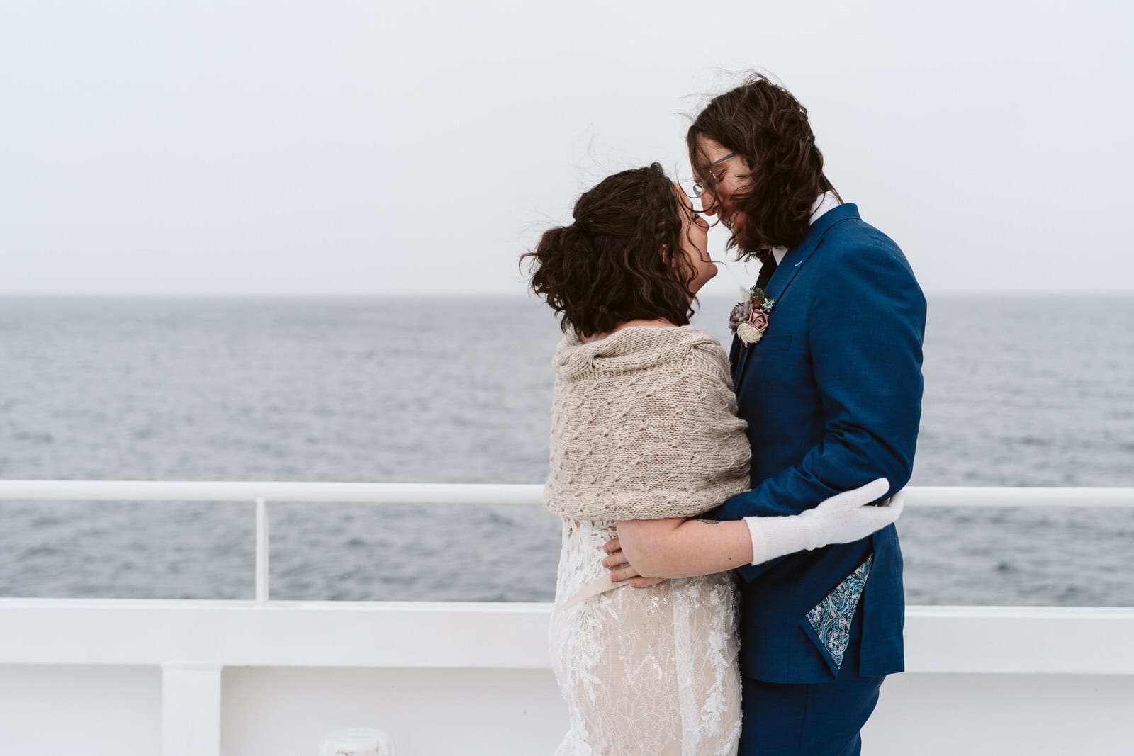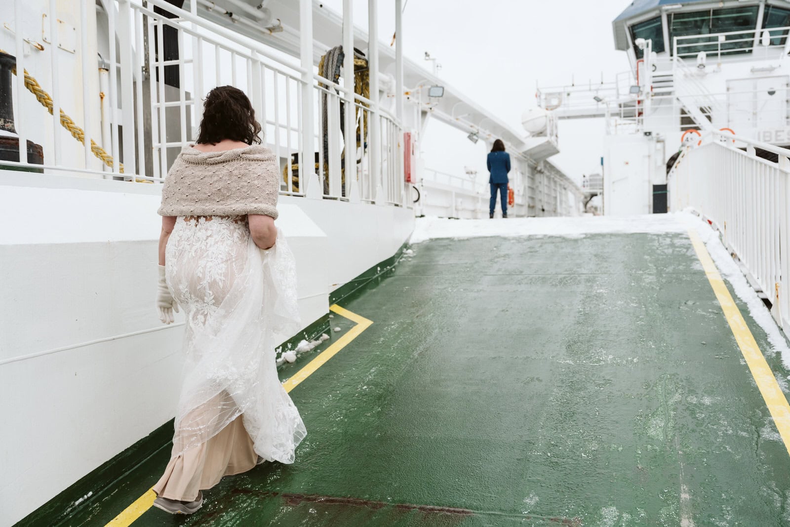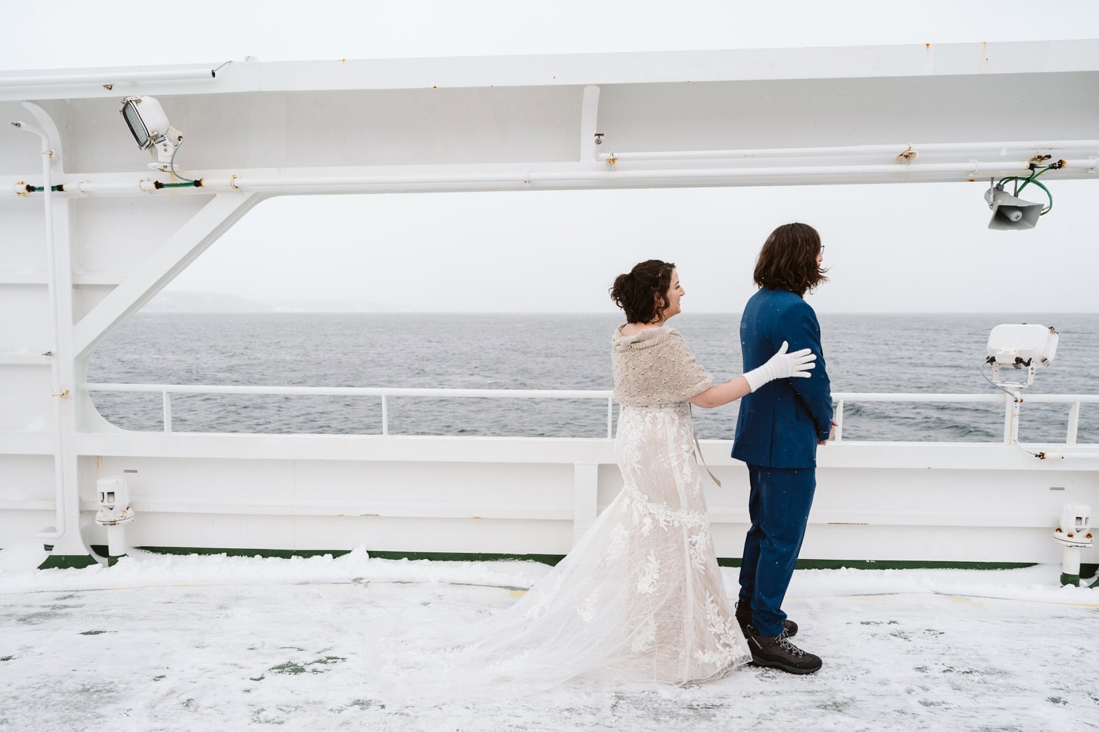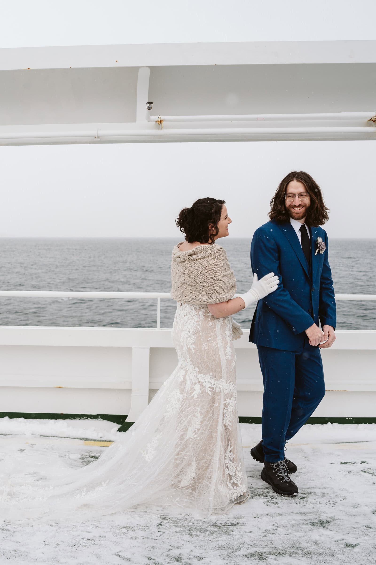 Shawna & David: We did our first look on a ferry. Ferries are “very Norwegian”, our photographer told us. (She is from Norway). We said our vows at a historical preservation. We embraced the very intense northern Norwegian winter weather for the rest of our honeymoon.
