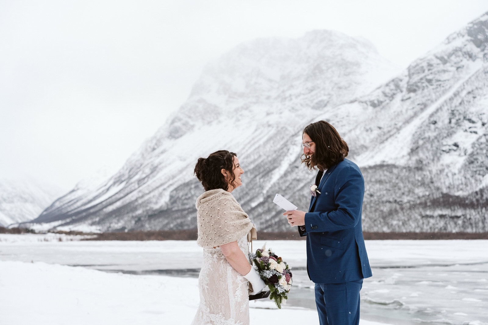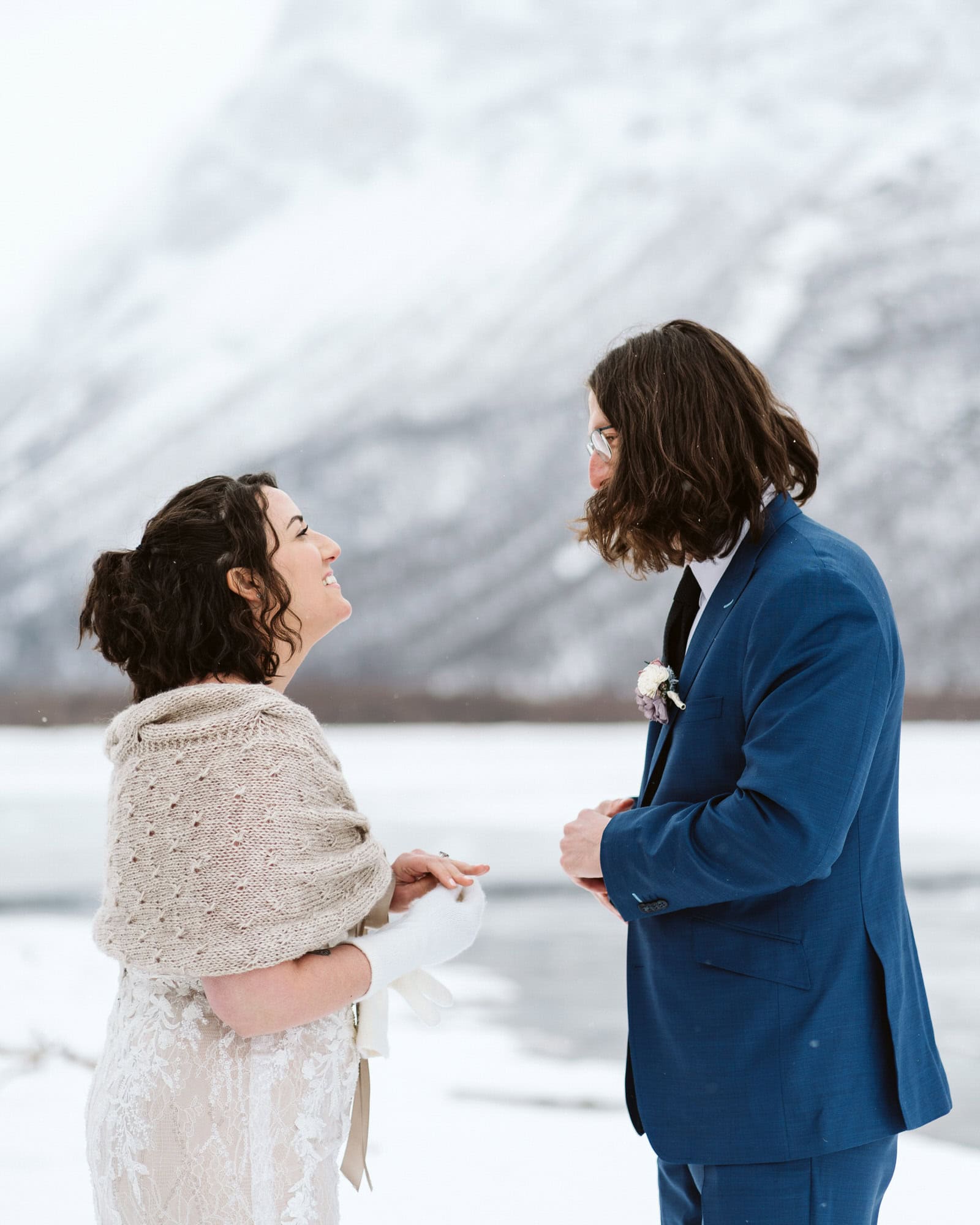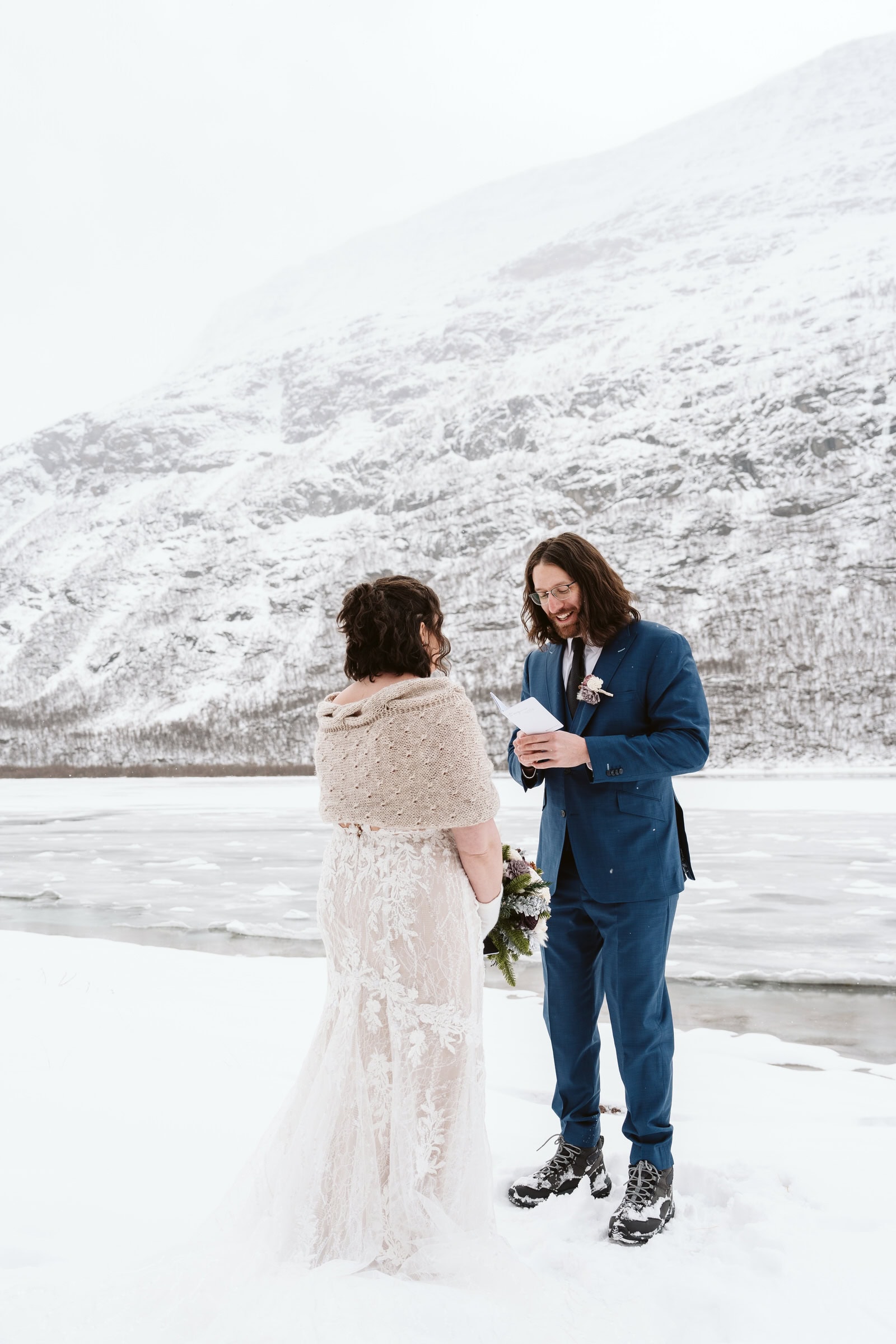 Shawna & David: Reading our vows with a stunning backdrop in a remote, spontaneous location where we don’t believe anyone else has ever been married before. We were so far off the beaten path, the air felt so still. Also, driving through an insane snowstorm and just laughing about the craziness of it all at the end of the day. Later, we went to a local pub, still in our dress & tux, to share a pizza and some beers. We love low-key vibes, so ending the day this way was perfect for us.